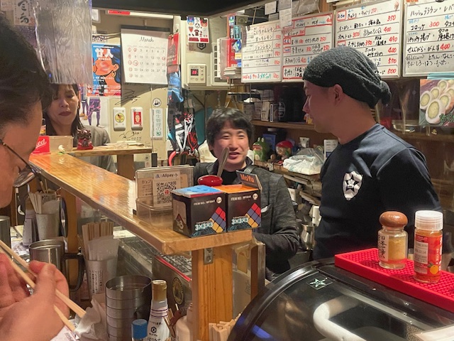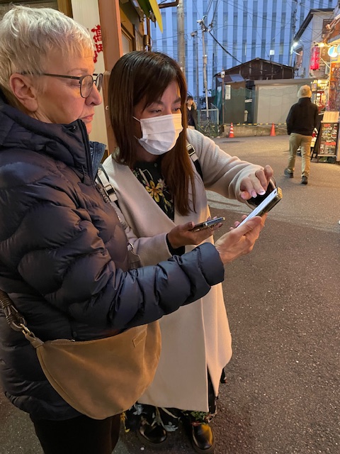 Am zweiten Abend landen wir in einem Viertel mit ebenfalls kleinen Restaurants, densogenannten Izakayas. Meistens nur 8-10 Plätze. Wir lassen uns von google Map leiten und wählen im ersten Restaurant wieder Austern und Sashimi und in einem anderen verschiedene Fleischspieße. In diesem ist eine tolle Stimmung, wir sind mitten im Trubel und der Wirt und alle Gäste kümmern sich um unser Wohlergehen, obwohl niemand englisch spricht. Google Translator ist im Dauereinsatz. Ein sehr schönes Erlebnis.