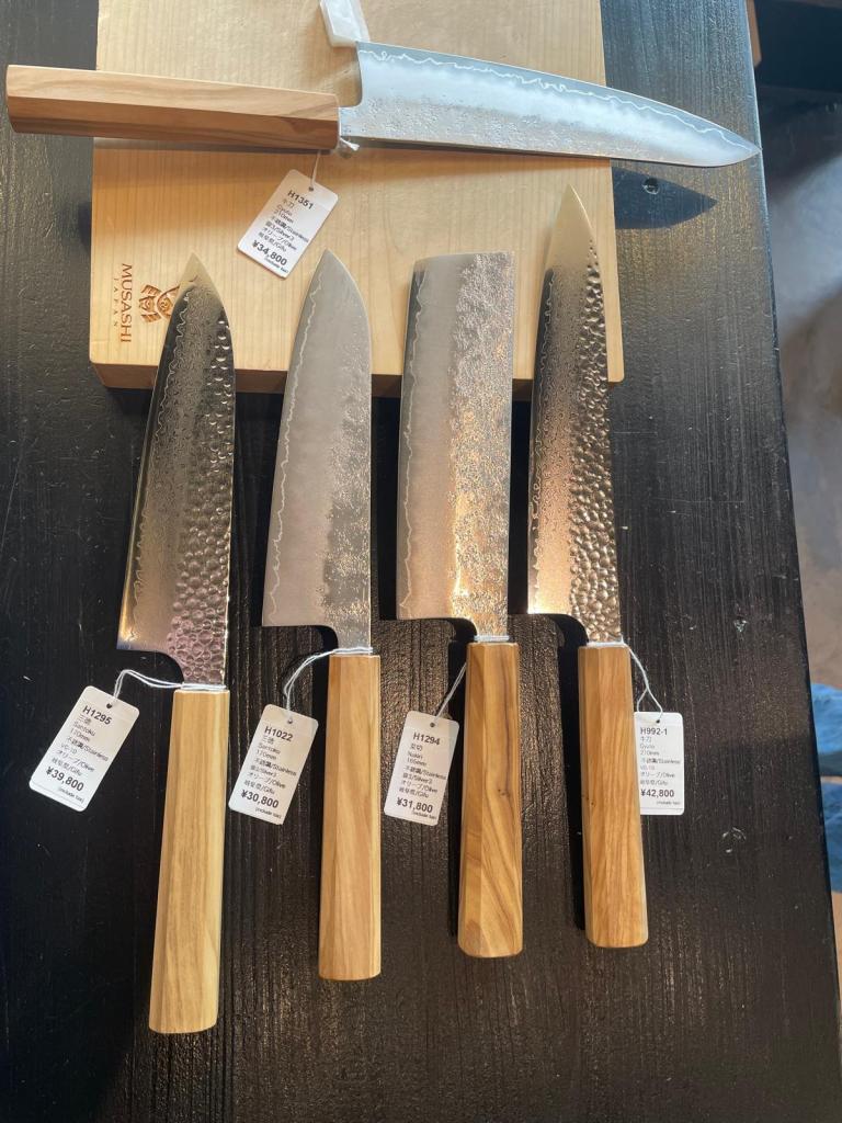 Yayoi: Moderne, wunderschöne Schmiedekunst mit tollen Holzgriffen und Damast-Optik am Stand im Markt.