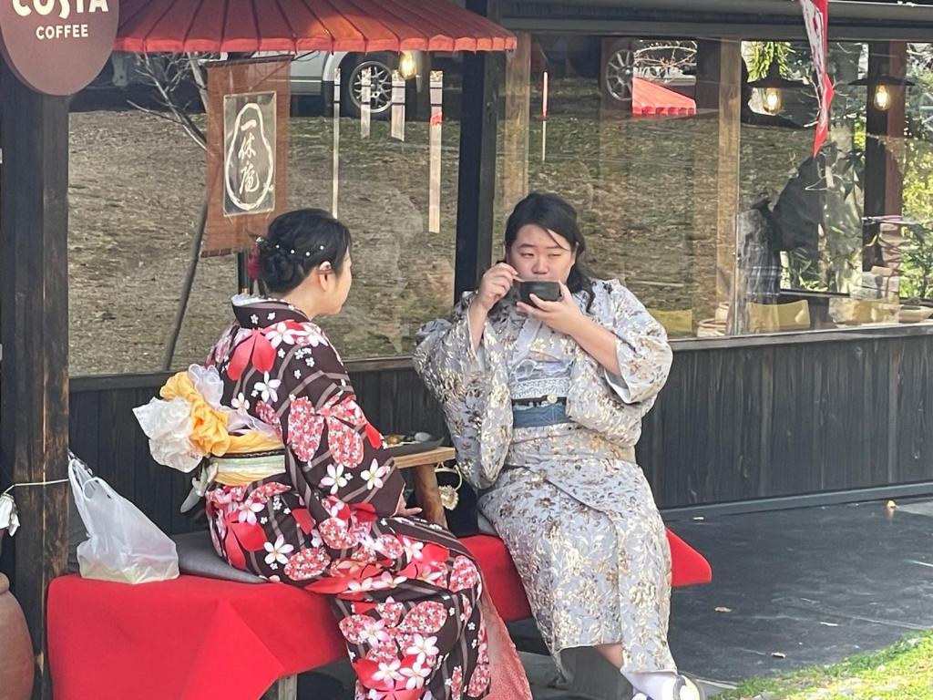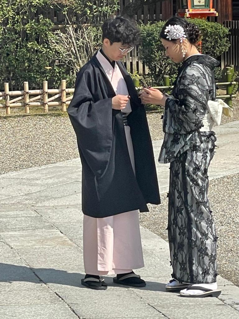 In einem nahegelegenem Park schlendern die Menschen mit schicken Kimons. Es schein ein beliebte Attraktivität zu sein, sich eine Ausstattung zu leihen, sich zu frisieren und zu schminken. Das machen nicht nur die Japaner*innen sondern auch viele Touristen. Natürlich wird alles fotografiert, gern auch vom Profi.