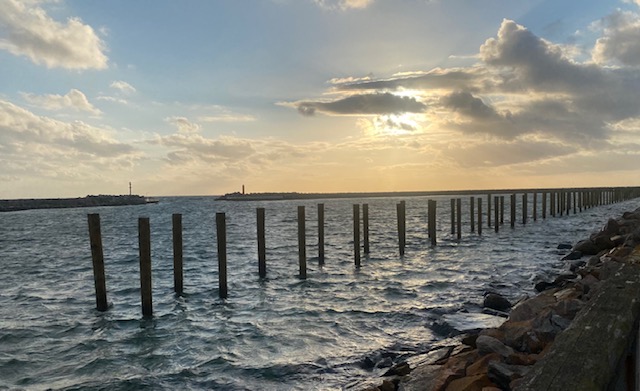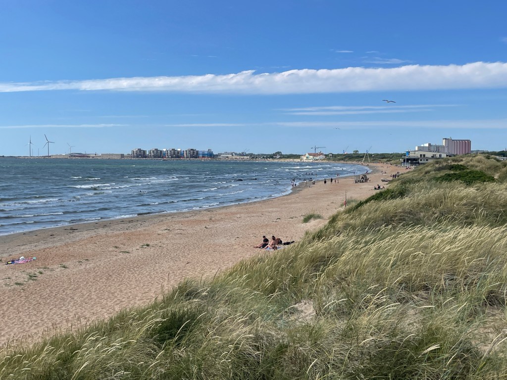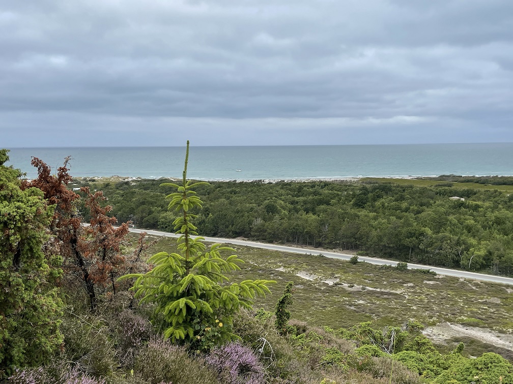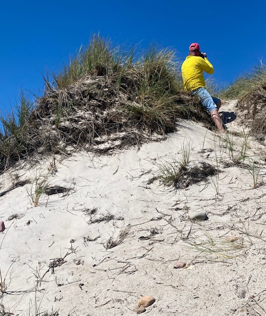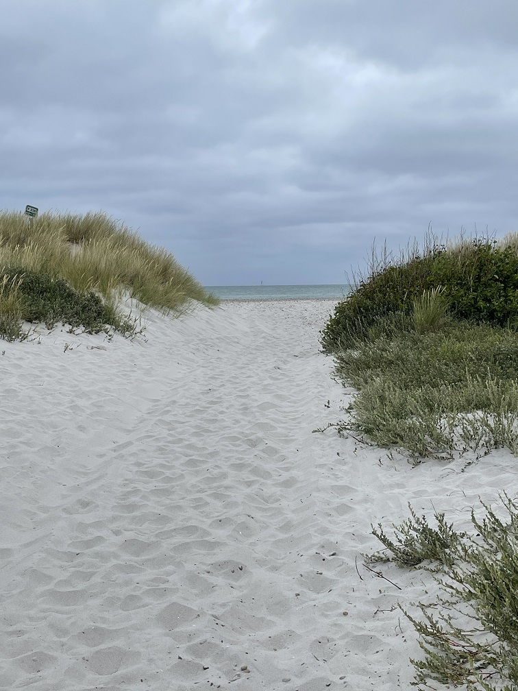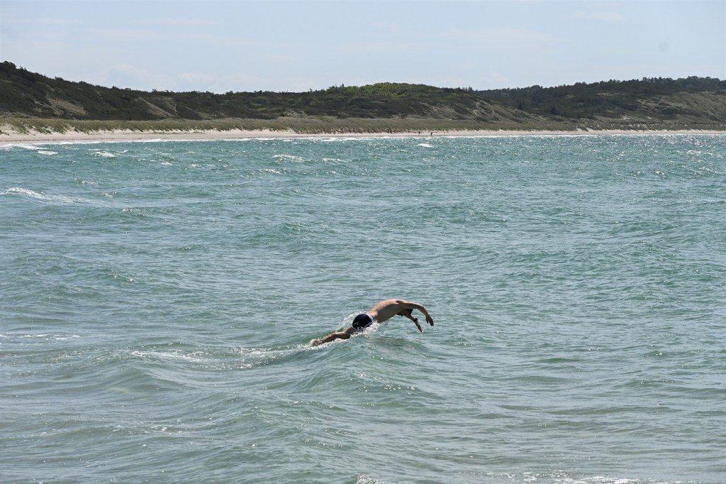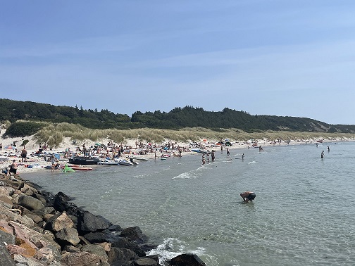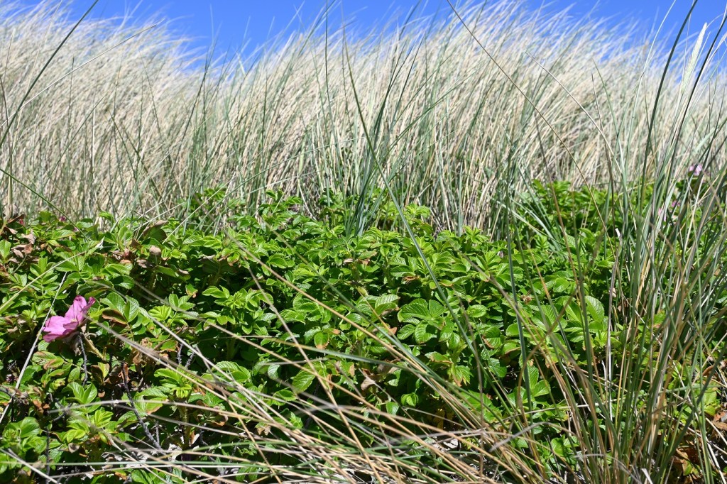Hier gibt es Dünen und es wachsen Dünengras und Hagebutten. Es sieht nicht nur aus wie auf Sylt, sondern riecht auch so schön – herrliche Luft. Ute fühlt sich gleich wie Zuhause. Der Strand ist etwas steinig, da ist der beim Hafen im Westen schöner, feinkörnig lädt er zum Chillen und Baden (immer noch 16 Grad) ein.