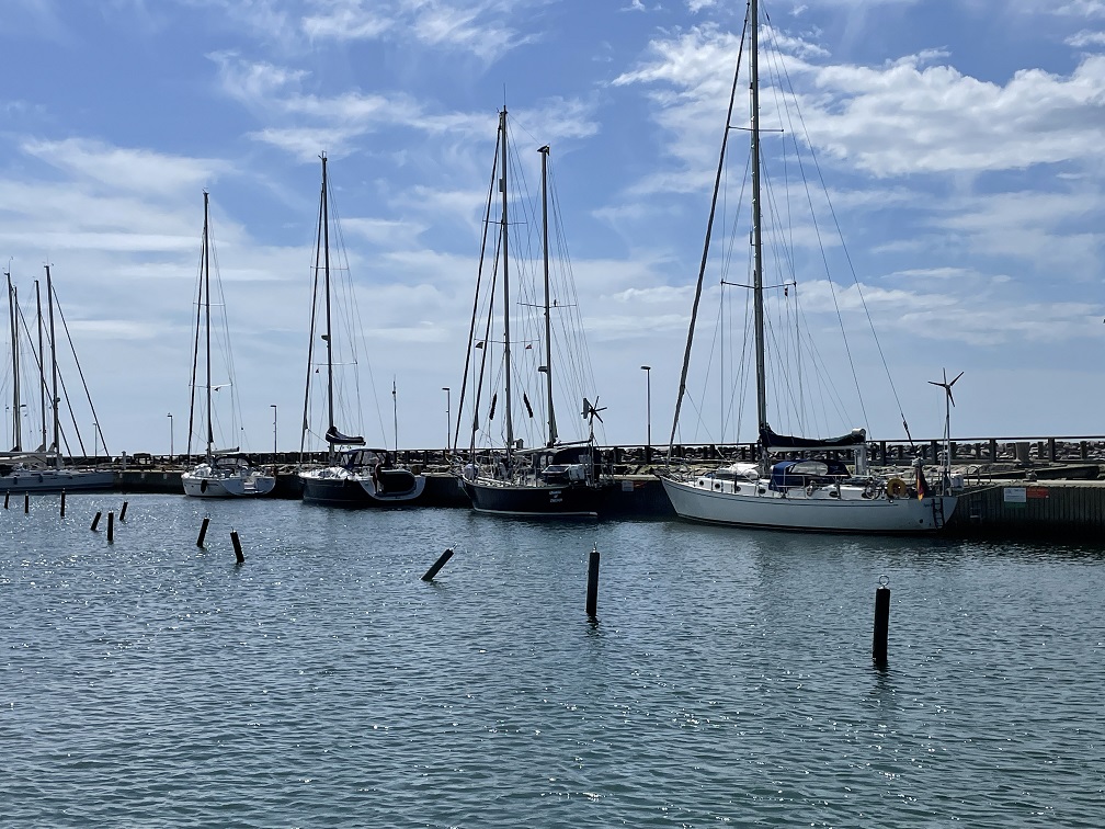 Es wird ein schöner Törn nach Gilleleje. Der Wind bläst mit 6 – 9 m/s aus West bis Südwest. Wir halten 10 Grad vor, weil er später gegen uns drehen soll. War aber nicht nötig. Schnell haben wir die 45 SM hinter uns gelassen und kommen nach 7,5h am Zielort an. Obwohl wir dank des Autopiloten nicht viel getan haben, sind wir ganz schön kaputt – wir werden alt.