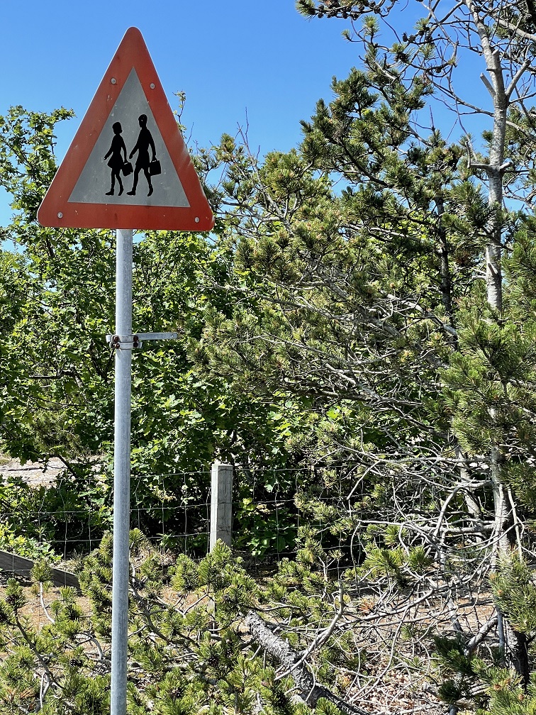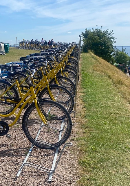 Von Schweden kommen täglich hunderte oder sind es tausende Tagestouristen und mieten sich amFähranleger auf der gegenüberliegenden Inselseite Fahrräder. Die sind alle gelb und fahren auf den zweieinhalb Straßen, es ist Verkehr wie in einer Großstadt. Auch sie schieben alle die Berge rauf und bei den steilen Abhängen auch runter. Abends ist dann Ruhe.