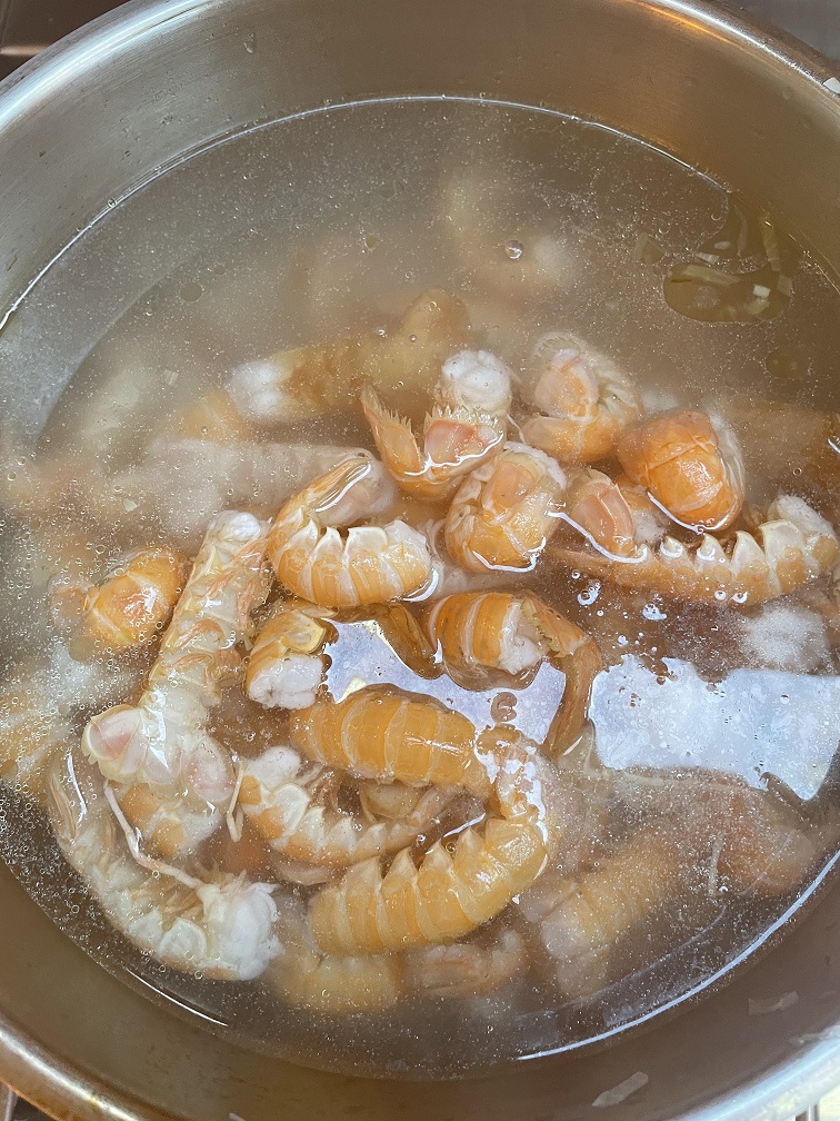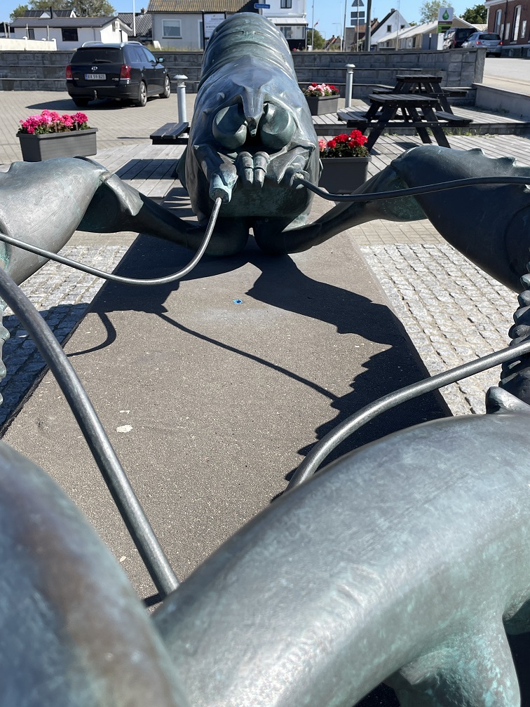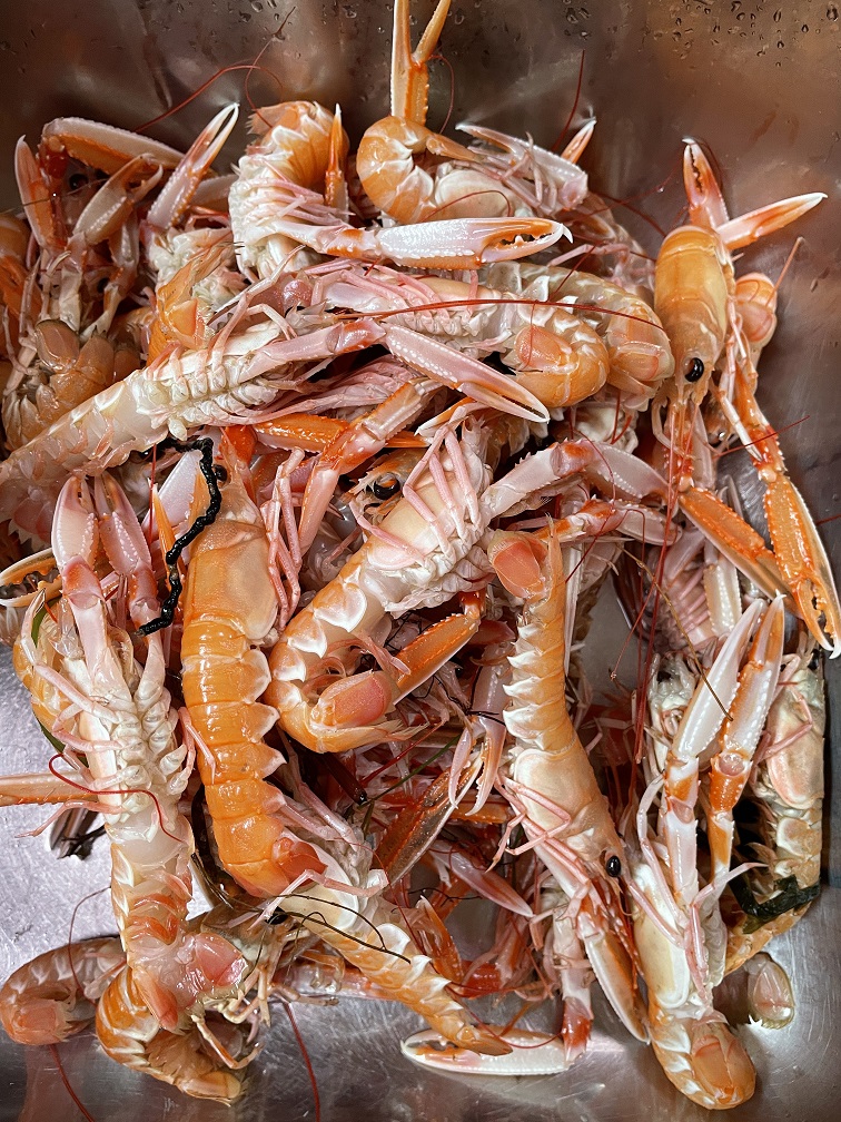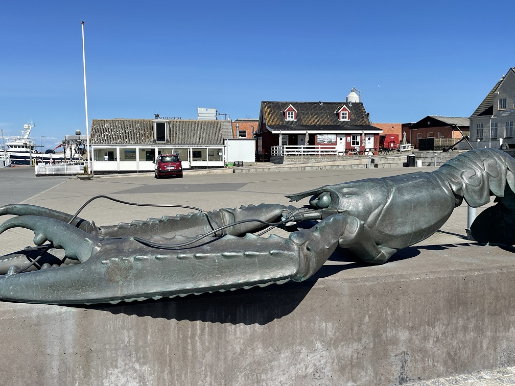In Laesö ist der Jomfruhummer zu Hause. Früher war es ein „Arme-Leute-Essen“, weil es Beifang der Fischer war. Aber inzwischen ist es eine Delikatesse und dementsprechend teuer. Wie Hering bei uns. Es ist kein Hummer sondern eher eine Art Kaisergranat. Wir erfahren man braucht 1 kg für zwei Leute als Hauptgericht, allerdings nur die Schwänze, wo das Fleisch sitzt. Die Zubereitung ist sehr einfach. Wir kochen sie zuerst 3 Minuten und dann braten wir sie kurz an. Danach werden sie mit einem Dip und Kartoffelecken gegessen. Man muss schon etwas arbeiten, aber sie sind sehr lecker, und schmecken tatsächlich etwas wie Hummer.