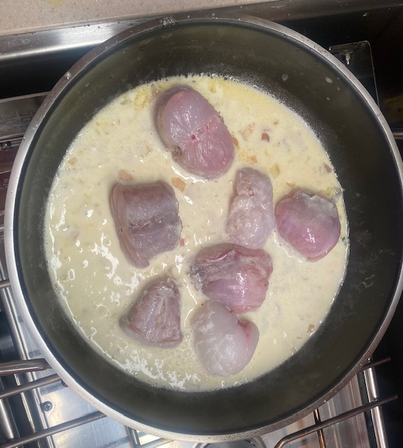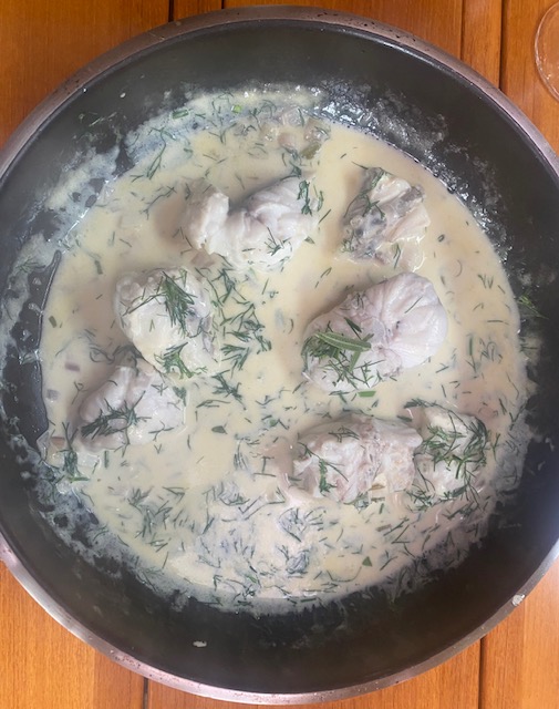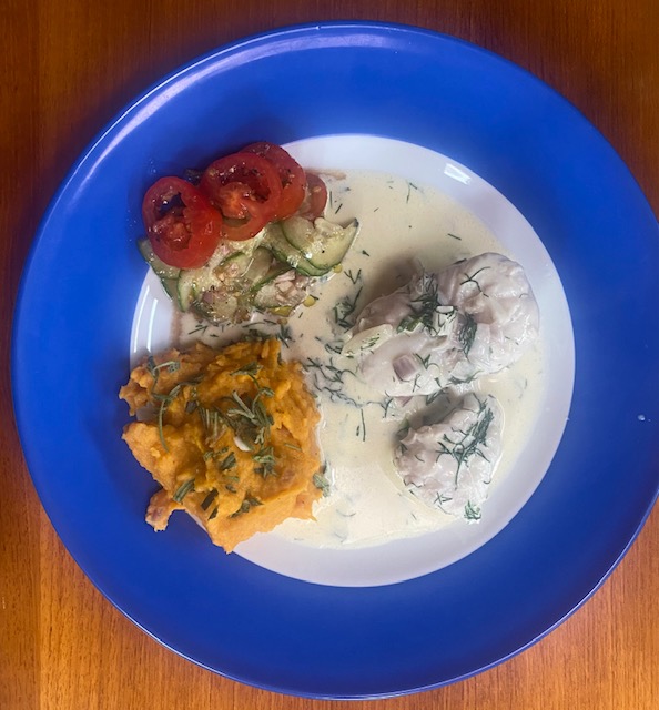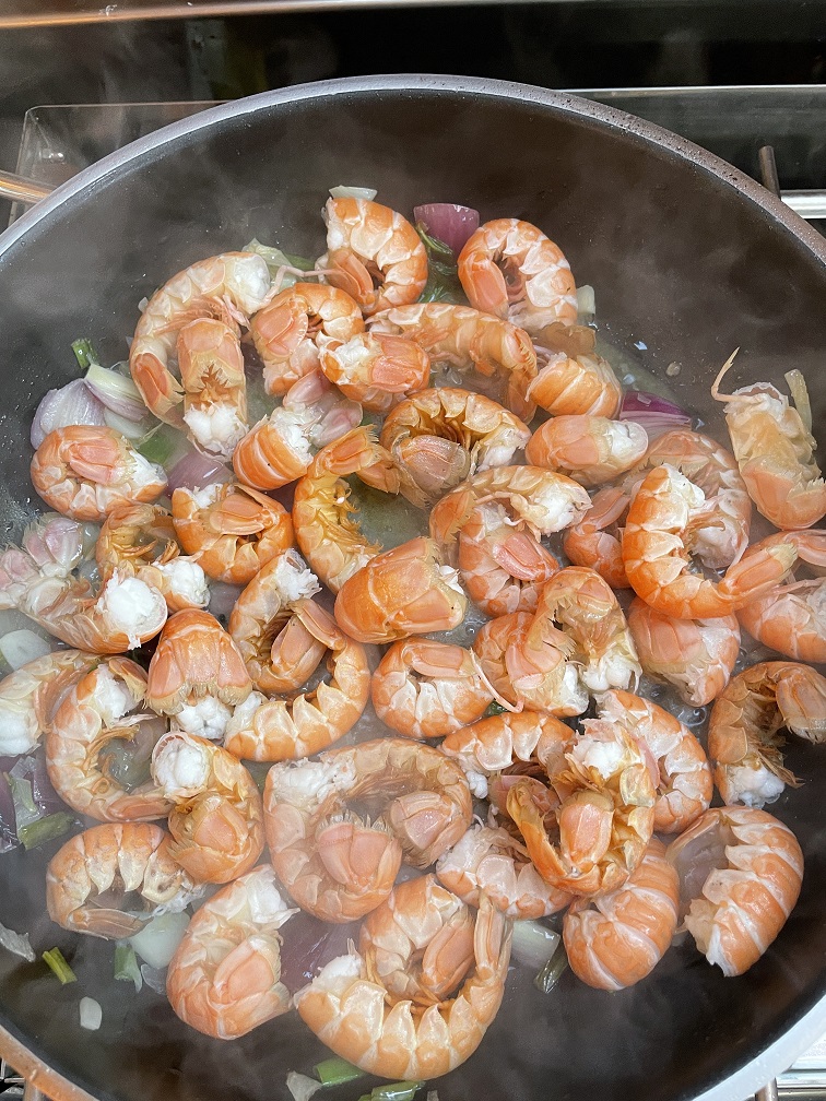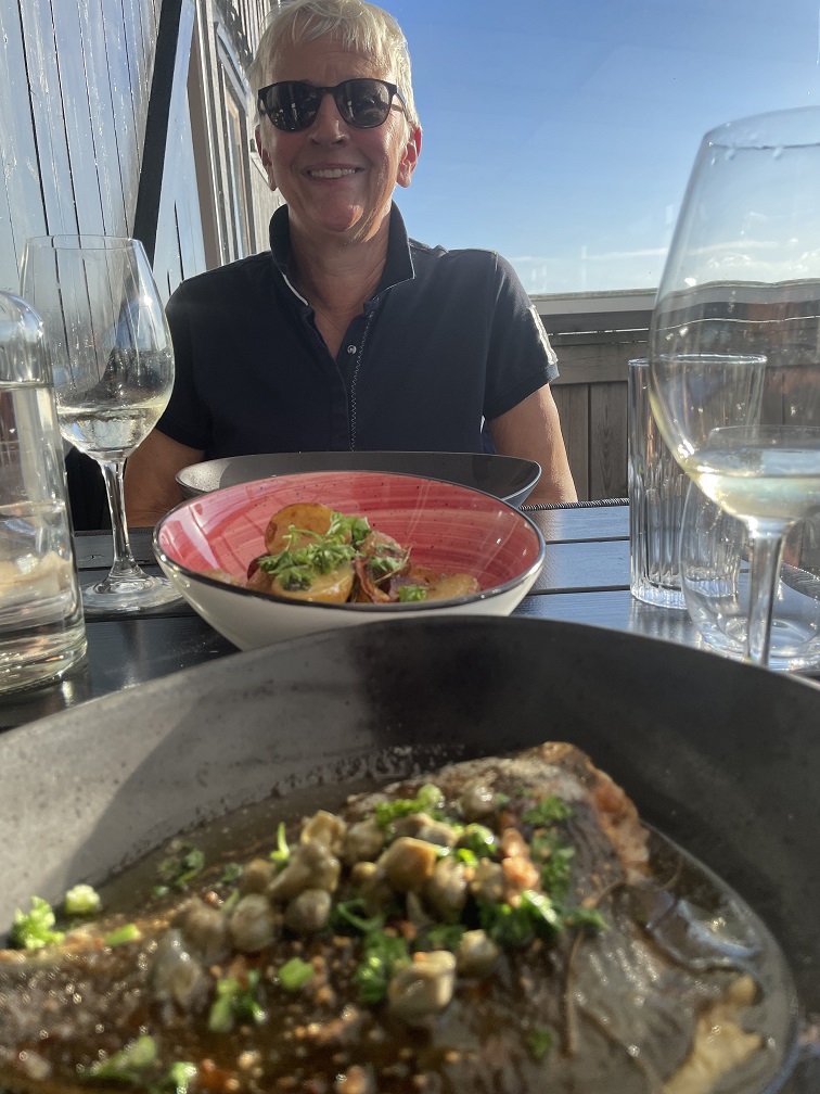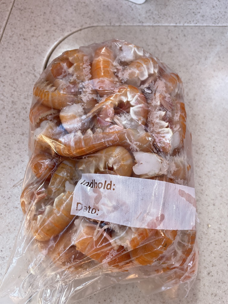 In Laesö ist der Jomfruhummer zu Hause. Früher war es ein „Arme-Leute-Essen“, weil es Beifang der Fischer war. Aber inzwischen ist es eine Delikatesse und dementsprechend teuer. Wie Hering bei uns. Es ist kein Hummer sondern eher eine Art Kaisergranat. Wir erfahren man braucht 1 kg für zwei Leute als Hauptgericht, allerdings nur die Schwänze, wo das Fleisch sitzt. Die Zubereitung ist sehr einfach. Wir kochen sie zuerst 3 Minuten und dann braten wir sie kurz an. Danach werden sie mit einem Dip und Kartoffelecken gegessen. Man muss schon etwas arbeiten, aber sie sind sehr lecker, und schmecken tatsächlich etwas wie Hummer.