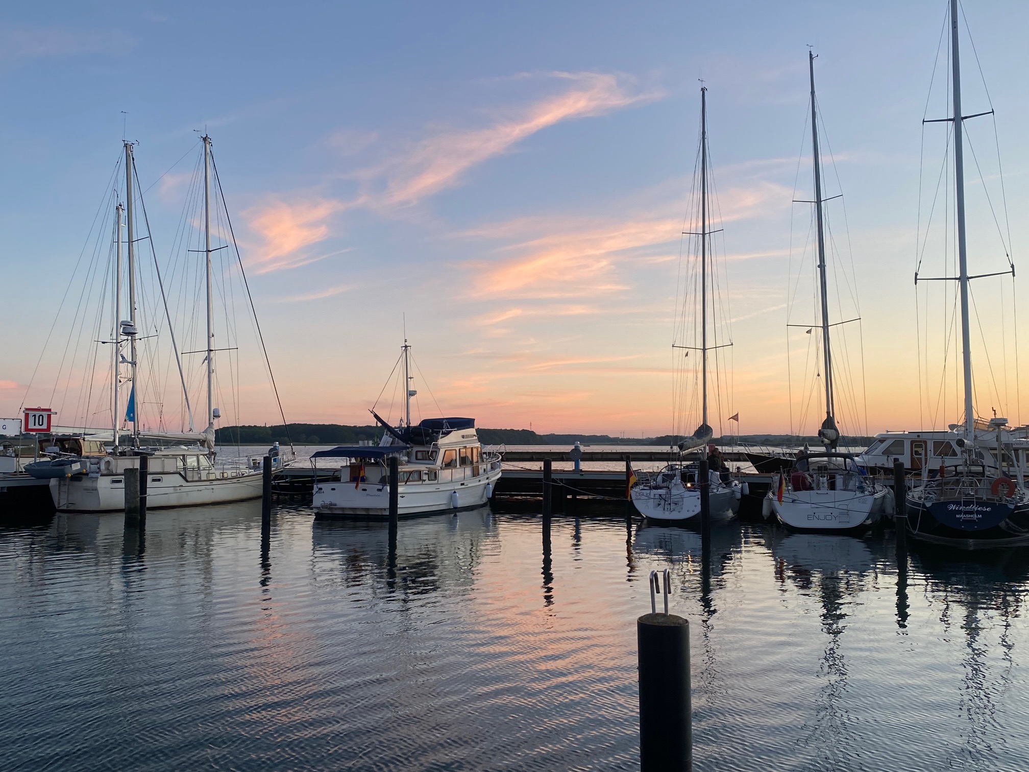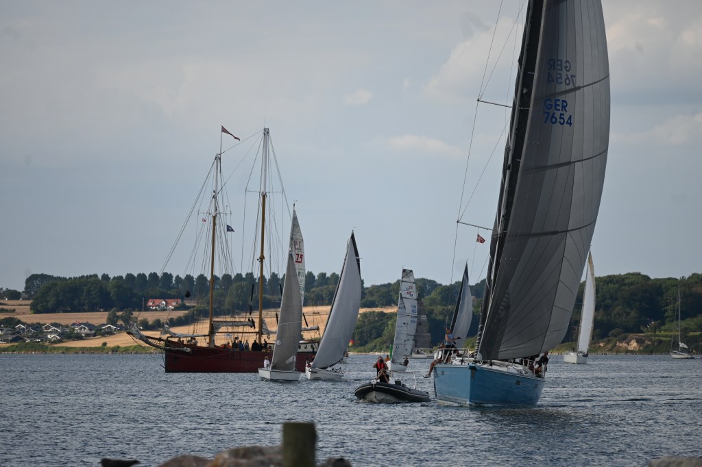Wir sind recht früh gestartet und trotz allem relativ schnell gesegelt. Die anderen Segler aus der Schlei etc. sind hinter uns, deshalb bekommen wir einen der schönsten Plätze im Hafen, mit freiem Blick über das Wasser zur Küste.