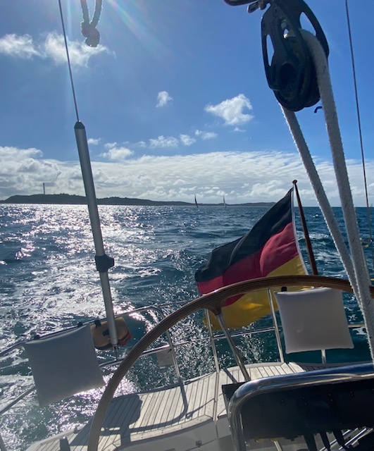 Wir haben schönen Wind, ohne Böen, von 6 m/s von Südwesten, so dass wir Halbwind segeln können. Die Welle ist nach den starken Winden der letzten Tage noch vorhanden, nervt aber nicht so, weil sie nicht so achterlich kommt. Start ist 8:55 Uhr und um 15:55 Uhr haben wir die 48 SM hinter uns gelassen, davon nur 3 SM unter Motor, denn bei der Annährung zur Insel schlief der Wind von einem Meter auf den anderen ein.