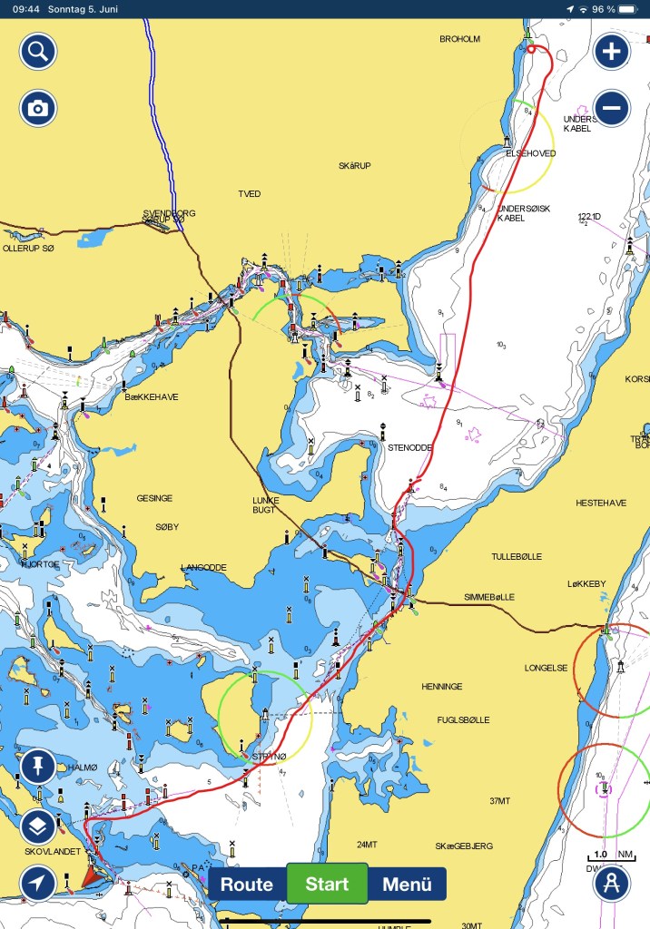 Das erste Etappenziel ist die Insel Samsö im südlichen Kattegat. Das sind knapp 100 SM, also für uns normalerweise 3-4 Tage. Wir haben uns für den mittleren der drei Wege entschieden, also durch den Großen Belt. Einerseits sind es ca. 10 SM weniger und anderseits soll der Wind von heute Nord auf Ost drehen. Da wollen wir nicht erst nach Westen in den „Kleinen Belt“ und dann wieder nach Osten. Segeln ist auch immer ein kleines Strategiespiel.