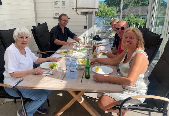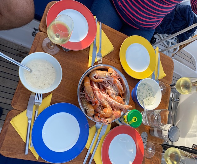 Nächsten Abend laden wir zu „Jomfruhummar satt“ ein. Die beiden und wir haben direkt vom Kutter 4 Kg gekauft, diesmal im Ganzen. Die gibt es klassisch, kalt mit Aioli und Salat.