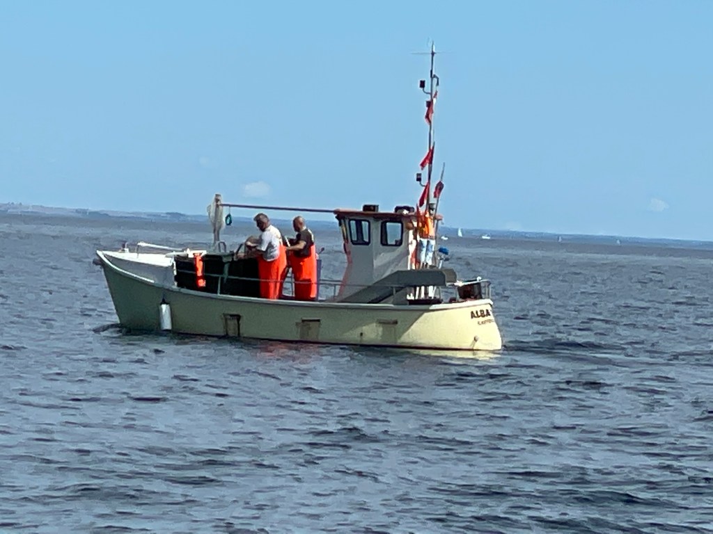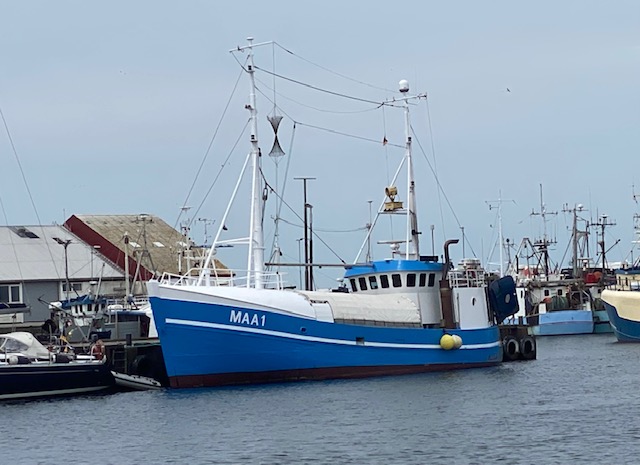 Interessant finden wir, dass hier der Fischer MAA1 ist, der sonst immer im Hafen von Maasholm liegt. Darf der hier fischen? Bringt der die Fische nach Deutschland? Eher nicht, oder?