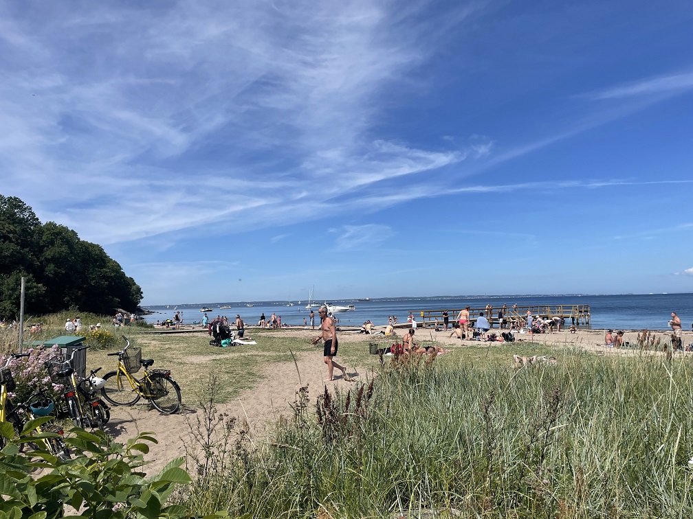 Es ist einfach zu schön hier: Sonne, Luft warm aber nicht zu heiß, sehr schöner Strand, Wasser immer noch etwas kühl – entspanntes Leben. Tagsüber machen wir kleine Wanderungen über die Insel, die auch einen Berg, den Nordbjerg, hat. Abends hören wir Musik in einer der Hafenbars.