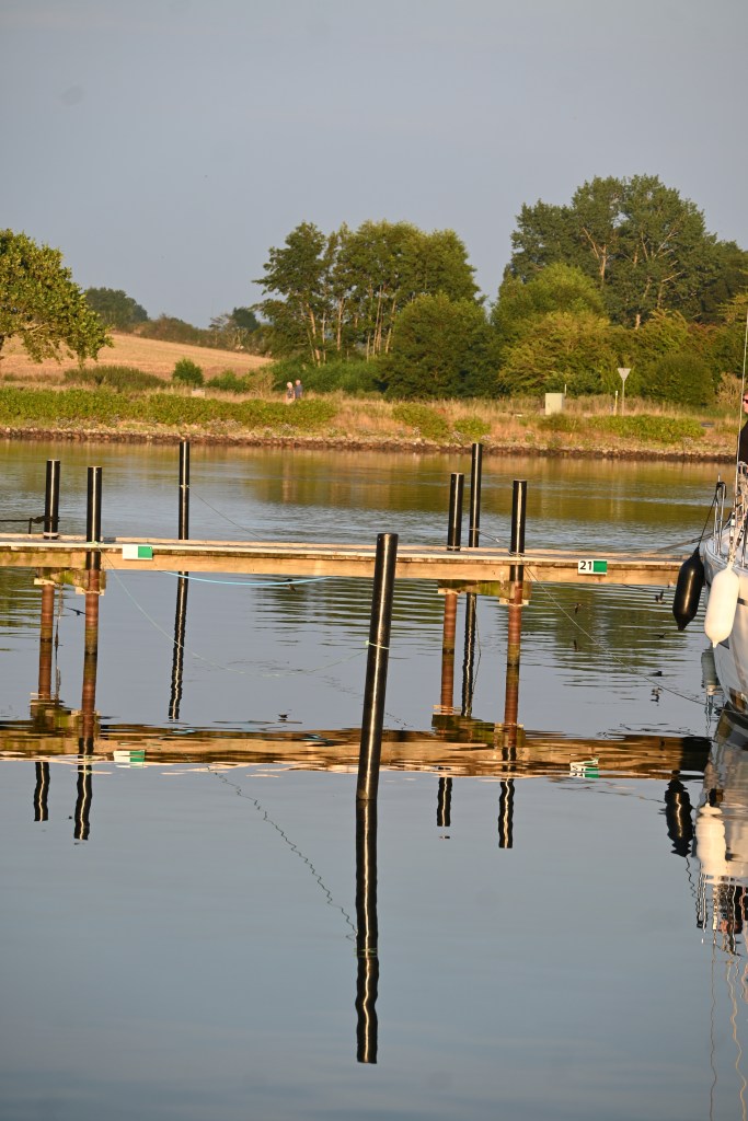 Wir segeln also entspannt am nächsten Tag nach Heiligenhafen und bekommen einen unserer Lieblingsplätze, letzter Steg (12) mit Blick auf das Naturschutzgebiet und den Graswarder. Da merkt man gar nicht die fast 1.000 Boote, die hinter uns im Hafen liegen. Herrlich ist es, wenn wir direkt vom Schiff ins Wasser springen und einige Meter schwimmen können.