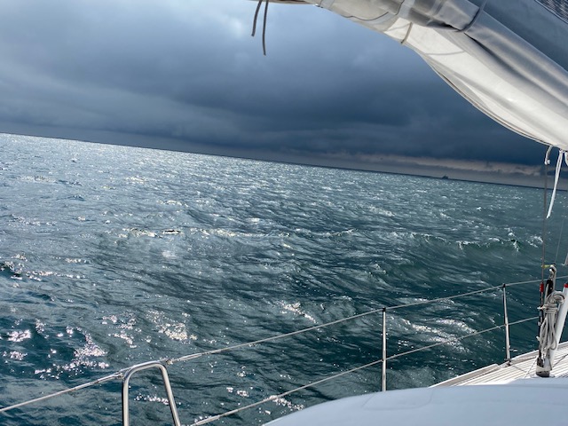 Wir haben die Hoffnung, dass sich nach den Wolken der Wind beruhigt, so war es vorhergesagt. Denkste! Der Wind und v.a. die Wellen nehmen sogar noch zu. In der Spitze haben wir über 12m/s und sicher Wellen von 3 Meter Höhe. Manchmal war es wie auf der Achterbahn.