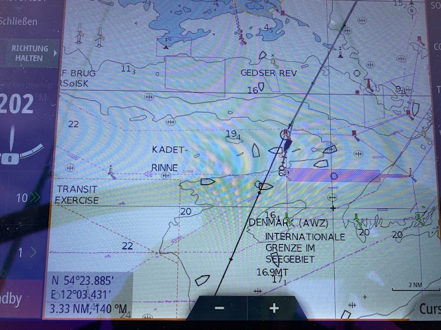 Und an der Küste vor Kiel, in der Hohwachter Bucht, ist das große Schießübungsgebiet jeden Wochentag aktiv. Uns kommt es reichlich komisch vor, dass viele Sportboote wie an der Perlenkette gezogen durch das Schießgebiet fahren. Dann erfahren wir über Funk, dass die Sportboote aber mitten durch das Gebiet auf dem Kiel-Fehmarn-Weg fahren dürfen. Das erinnert an die laufenden Zielscheiben auf dem Jahrmarkt. Wir fahren ihnen aber trotzdem hinterher.