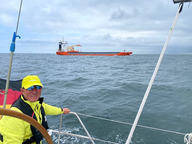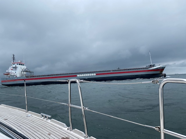 Plötzlich droht am Horizont ein kleines Unwetter, der Himmel verdunkelt sich und die Wolken sehen bedrohlich aus. Wir holen die Fock rein und verkleinern damit die Segelfläche erheblich. Die 60-90 Grad zum scheinbaren Wind können wir auch mit dem Groß anlegen. Leider fällt es zusammen mit der Querung der Kadett Rinne. Es ist eine Art Autobahn auf dem Wasser (Verkehrstrennungsgebiet), hier haben die Segler kein Wegerecht mehr. Die Kadett Rinne ist eine der meist befahrenen Wasserstraßen der Welt. Damit wir schnell reagieren können schalten wir den Motor zur Unterstützung an und freuen uns über die für eine Segelyacht üppigen 60 PS.