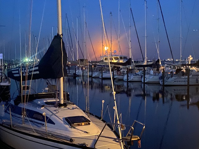 Aber lieber im Päckchen der letzte sein als der erste. Ersten läuft keiner über das Boot und man ist frei in der Entscheidungen am nächsten Morgen abzulegen. Wir sind im Hafenbecken eingekeilt und Dank des Bugstrahlruders und beherztem Gas geben kommen wir durch die schmale Gasse, die uns bleibt.