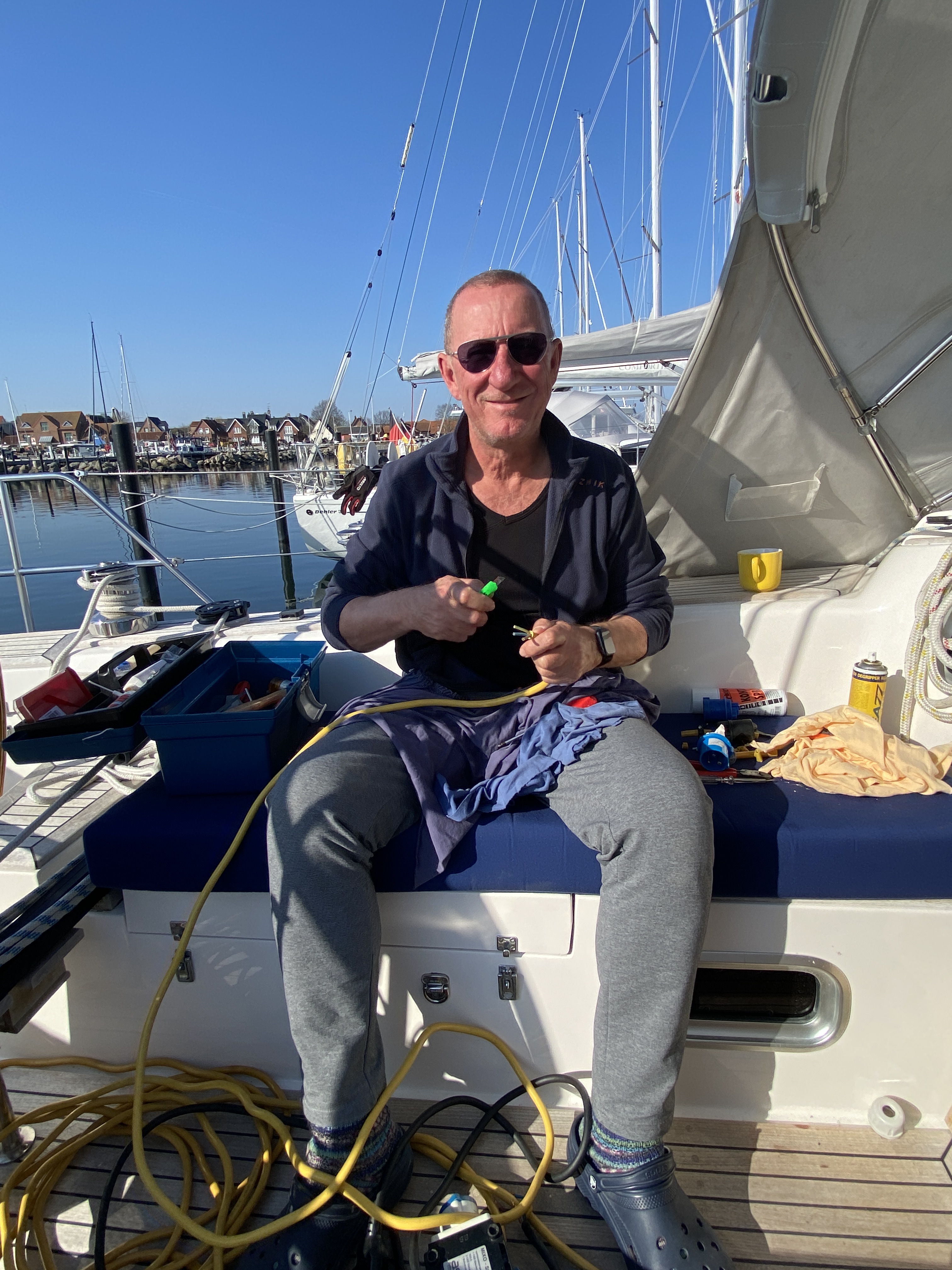 Seit einigen Tagen bemerken wir, dass das WC im Schiff immer weniger gut abläuft. Wir reden mit der Werft, bekommen gute Hinweise. Aber am Ende ist die Ursache, dass die Schläuche mit Urinstein verstopft sind. Die hätten wir im Winterlager austauschen sollen.