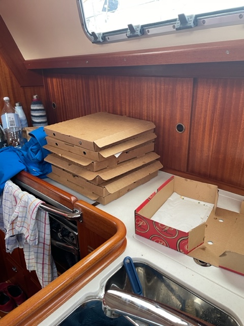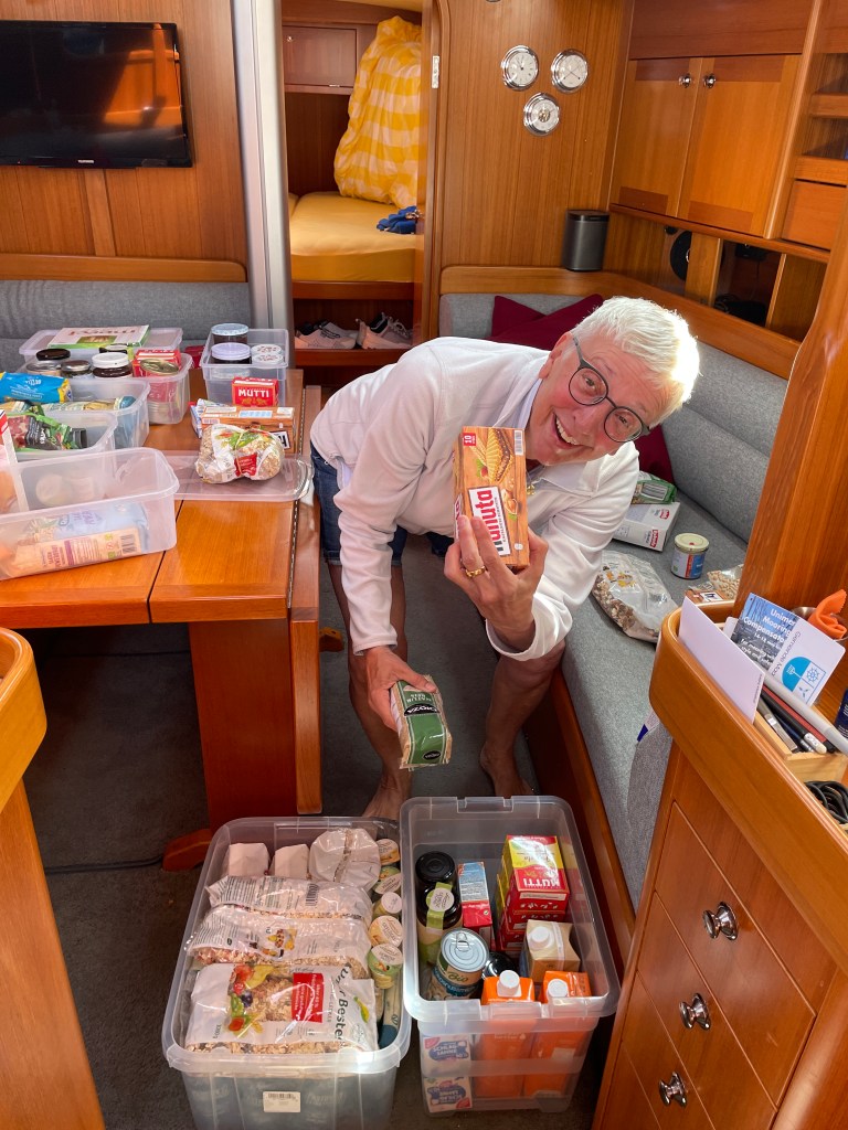 Die Tally-Woman hat ihren Job gemacht. Alle Vorräte sind eingekauft und in alle Ecken verstaut. Hoffentlich finden wir später alles wieder. Ein Auszug aus der Liste: Hanuta, die bevorzugte Pasta, zuckerfreies Müsli, Olivenöl, Bordapotheke und natürlich Bier und Wein.