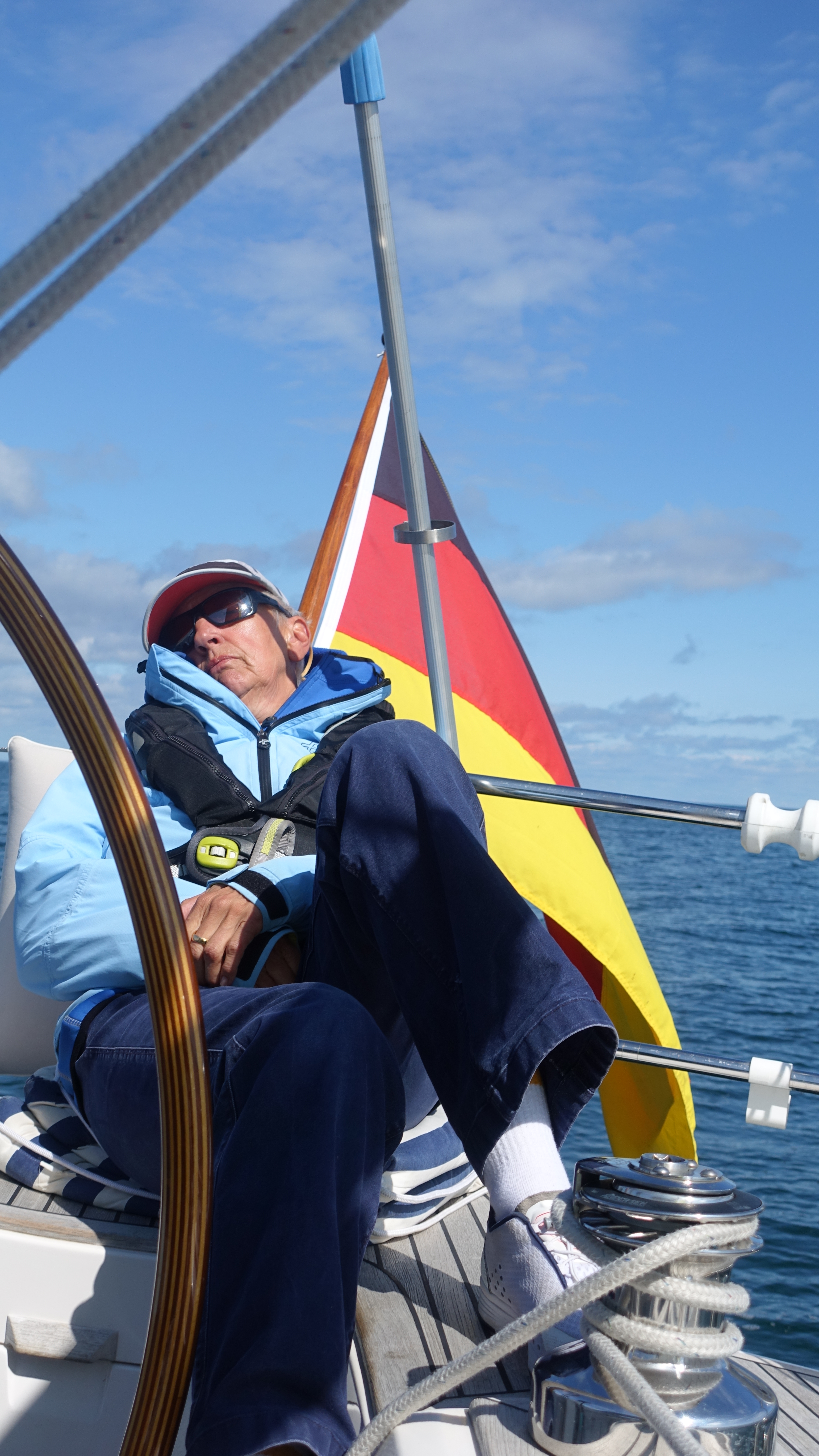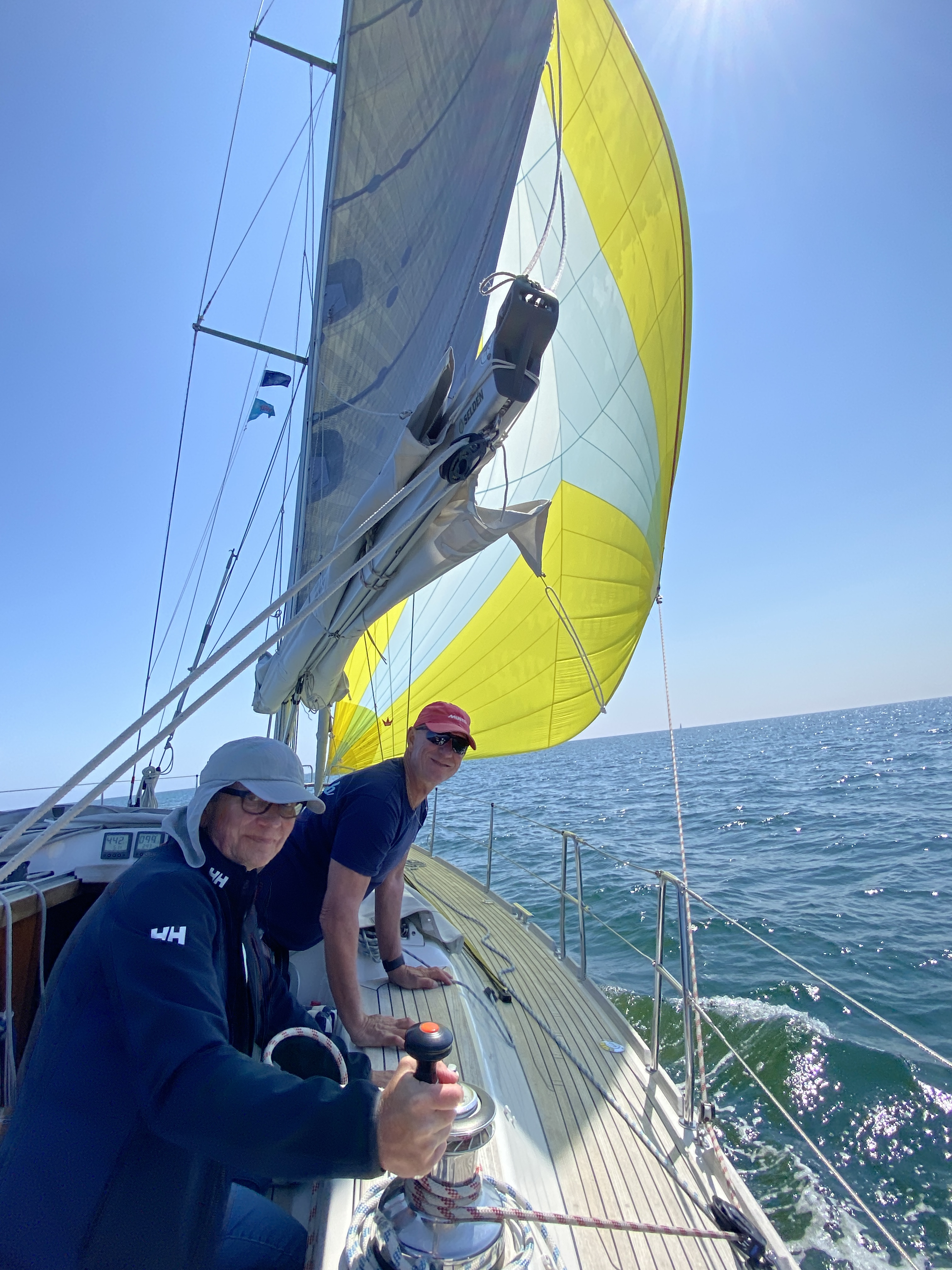 Wir erwähnen die Fahrt Simrishamn – Kristianopel nur kurz. 80 NM, viel Sonne und Wind von oben. Wir haben dafür ein neues Wort erfunden: „Loo“; nach Luv und Lee kommt Loo. Also meistens motoren und immer wieder erfolglose Versuche doch noch den Spinnaker zu setzten. Das Gute, nach jedem Versuch klappte das Hissen besser und Marcus konnte während der Fahrt am Schiff basteln.