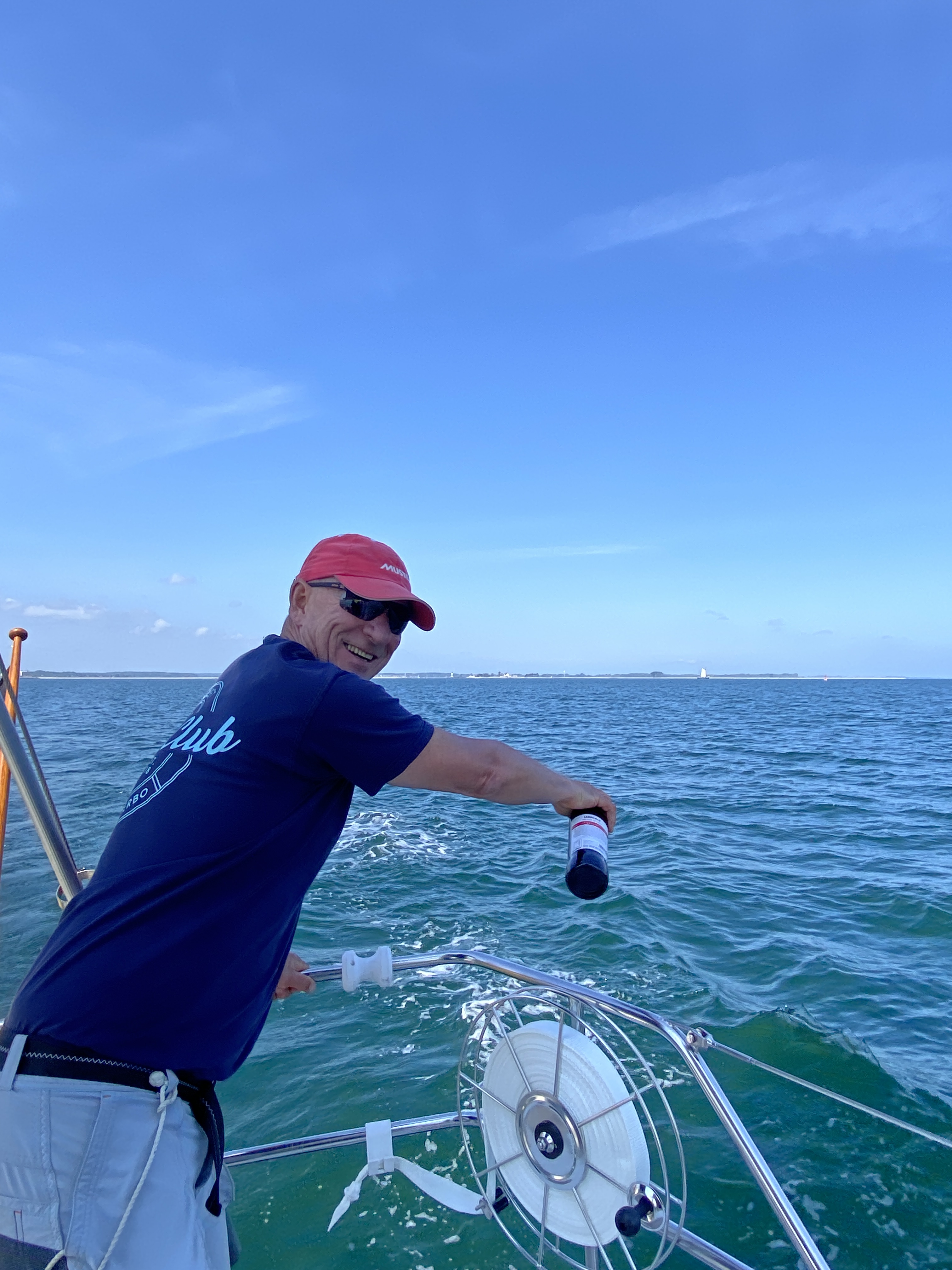 Das Wetter ist hervorragend, Sonne und Temperatur 20°++. Sogar der Wind kommt endlich mal nicht aus Ost oder Nord-Ost sondern aus westlichen Richtungen. ABER – er ist nur sehr schwach. Ute meint, wir waren am Anfang der Saison mit einem Schluck Sherry etwas geizig deshalb wird die Prozedur wiederholt und der Windgott Rasmus bekommt einen extra Schluck.