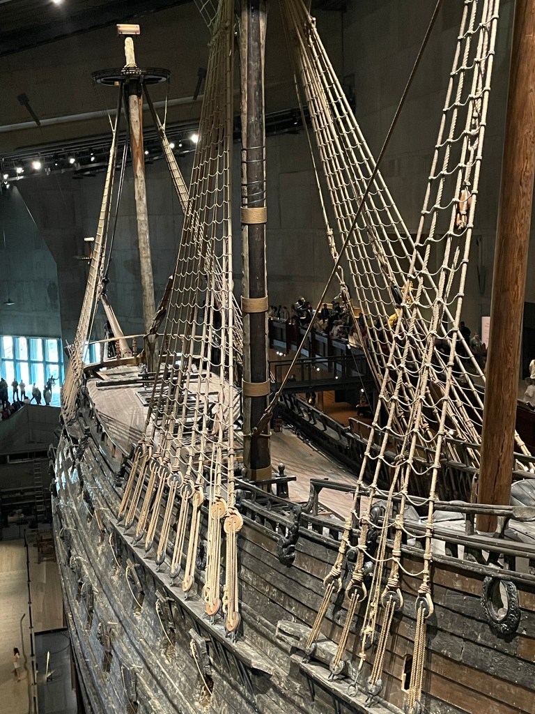 Wir gehen ins Vasamuseum. Dort wurde die Vasa, ein riesiges Kriegsschiff von 1630, restauriert. Es sank wenige Meter von der Werft entfernt gleich nach der Schiffstaufe, aufgrund mehrerer Konstruktionsfehler. Diese ergaben sich, weil eine Seite von Holländern (sie waren die Profis damals) und die andere von den Schweden gebaut wurde. Sie konnten sich nicht richtig verständigen und am Ende passte alles nicht zusammen. Ende der 1950er Jahre wurde das Wrack gehoben und aufwändig wieder hergestellt. http://www.vasamuseet.se/de