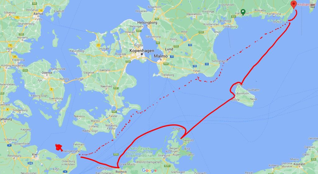 Wir wollen Fehmarn im Norden und Falster (DEN) im Süden passieren, dann Kurswechsel auf Nord vorbei an der Halbinsel Mön (DEN), Richtung Ystad (Kommissar Wallander) bzw. Simrishamn und über die Hanöbucht in den Kalmarsund. Anfänglich läuft es gut, 4-5Kn mit Code-Zero machen wir 6 kn. Dann schläft der Wind komplett ein – also starten wir widerwillig den Motor.