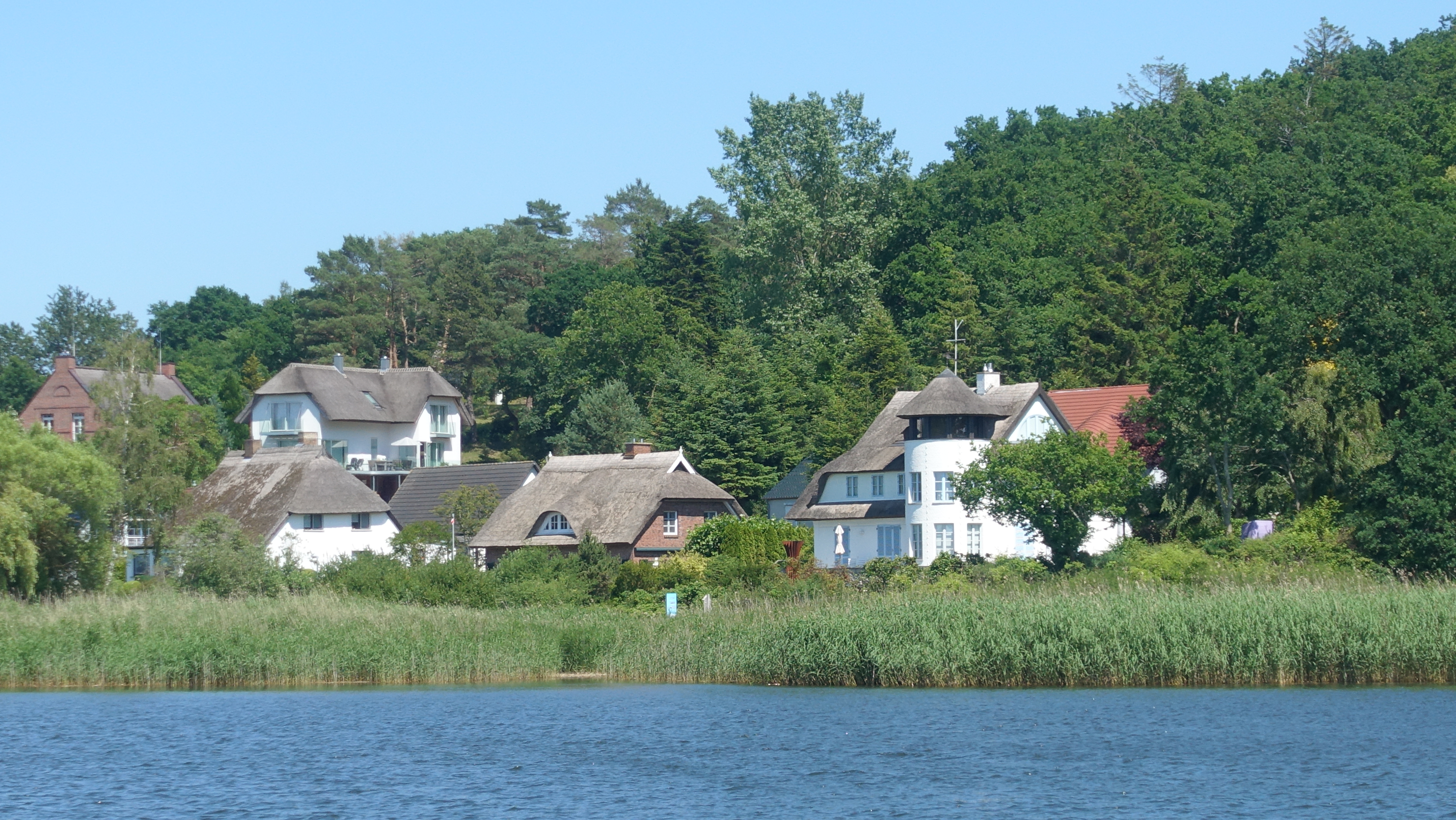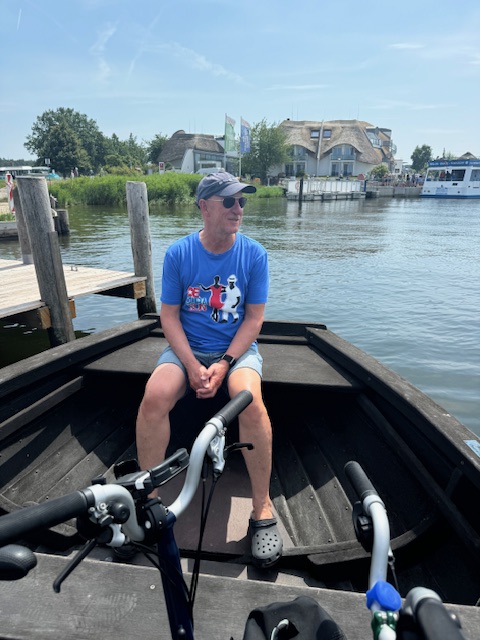 Ein Fahrradausflug über Baabe und Sellin. Um zu dem super gelegenen Restaurant Moritzburg zu kommen, müssen wir auf einen „Berg“ kraxeln aber vorher über die 20 m breite Baaber Bek (auch so ein Fluss zwischen den Bodden). Dafür steht eine Fahrradfähre bereit. Der Fährmann rudert uns auf die andere Seite. Schön, solche skurrilen Erlebnisse.
