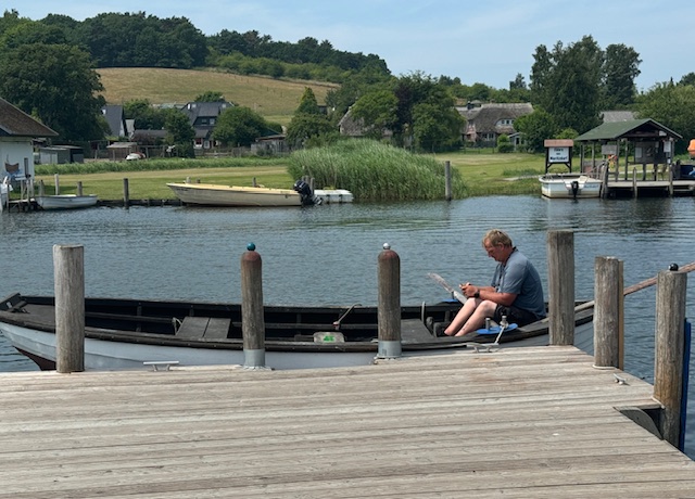 Heute können wir segeln, hoch am Wind bzw. kreuzend durch den Strelasund – also zwischen dem Festland und der Insel Rügen. Herrlich – ohne Wellen, aber mit Wind und Sonne. Bei einer Windstärke von 4-5 m/s machen wir 6-7 Kn – wir sind selbst erstaunt. Da sieht man mal, wie stark auch kleine Wellen das Schiff bremsen. Später geht es dann mit vielen Kreuzschlägen auf dem Bodden nach Seedorf, dort liegt der besagte Forellensteg. Man fährt von der Having in eine Art Flusslauf, 20m breit und auf beiden Seiten viel Schilf und einige Prachtvillen. Wiedermal fällt einem nur das Wort – wunderschön – ein.