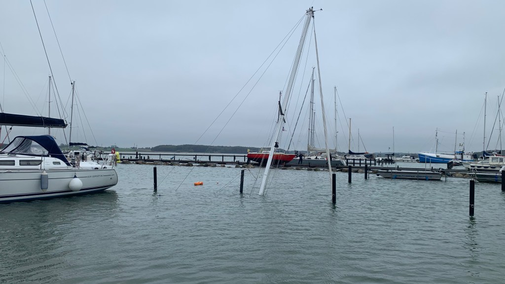 Das Wasser ist in hohen Wellen erst über das Naturschutzgebiet bei Schleimünde und dann über die Schutzmauer zu unserem Hafen Maasholm gekommen und hat die Marina fast komplett zerstört. Auf unserem Steg A lagen zwei Schiffe, die sich losgerissen hatten. Auf unserem Platz ist eine Comfortina 46 gesunken, da die Klampen am Steg rausgerissen wurden. Die Andante hatten wir übrigens eine Woche vorher nach Schleswig gebracht, sie stand sicher und trocken in der Halle.