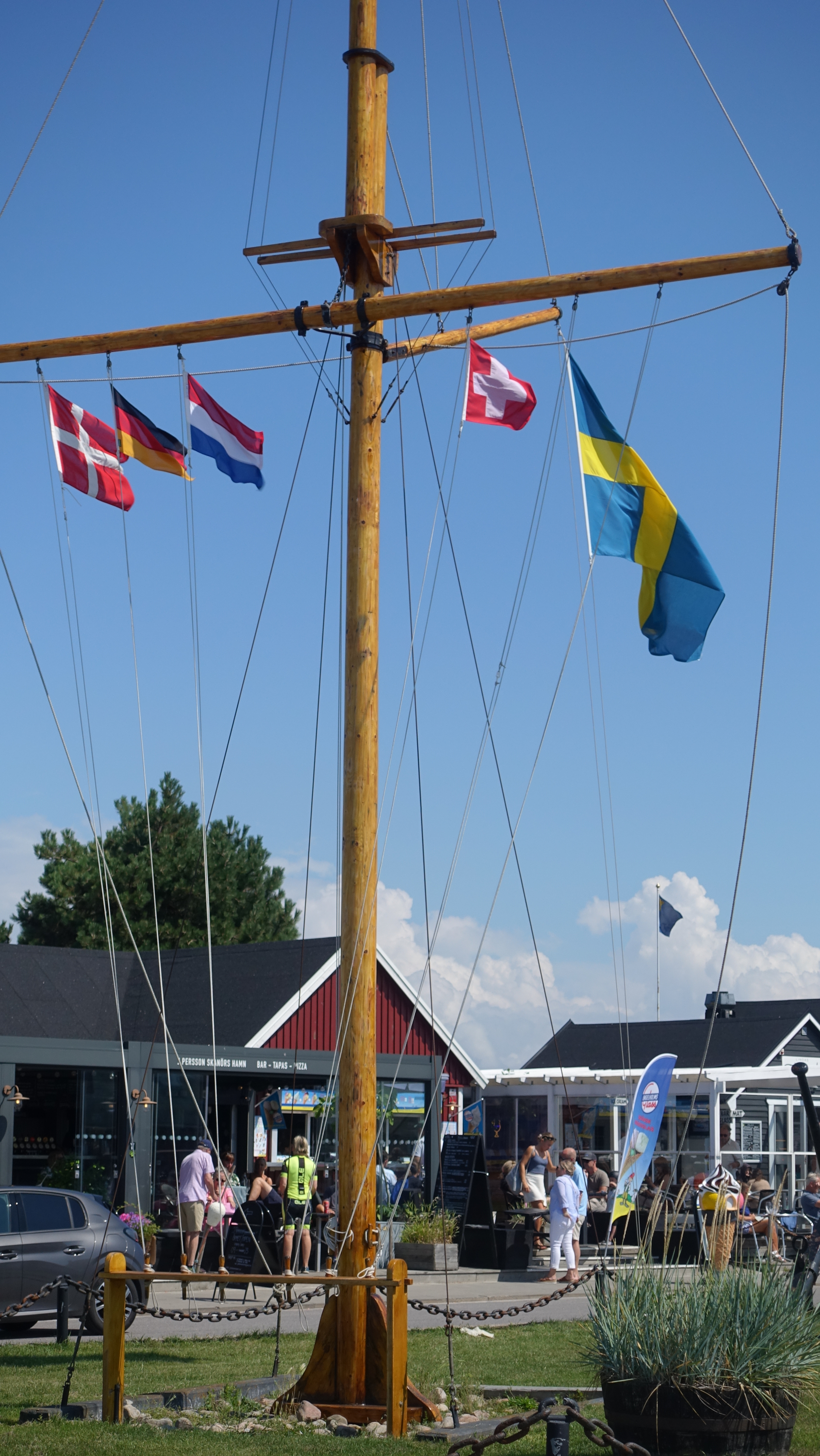 Wir wollen nach Skanör. Die Taktik geht auf, wir motoren die 8 SM und bekommen einen guten Liegeplatz, gegen den Wind. Der Hafen liegt direkt am Strand, der bei dem sonnigen Wetter voll belegt. ist. In der Umgebung gibt es zwei Golfplätze, schöne Villen und überall tollen Strand. Der Hafen selbst ist Treffpunkt für alle: quirliges Leben, nette Bars. Das Motto ganz klar: sehen und gesehen werden.