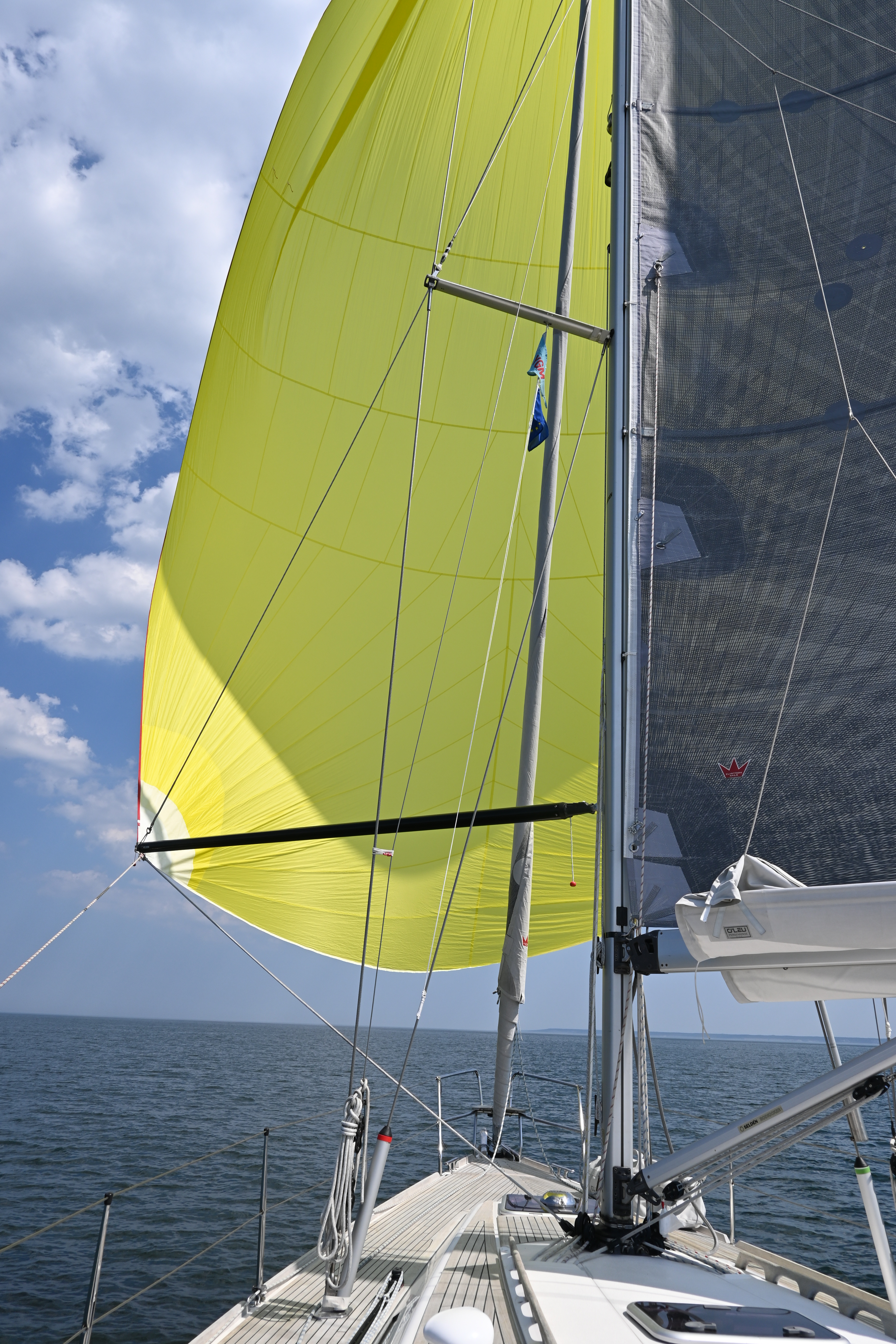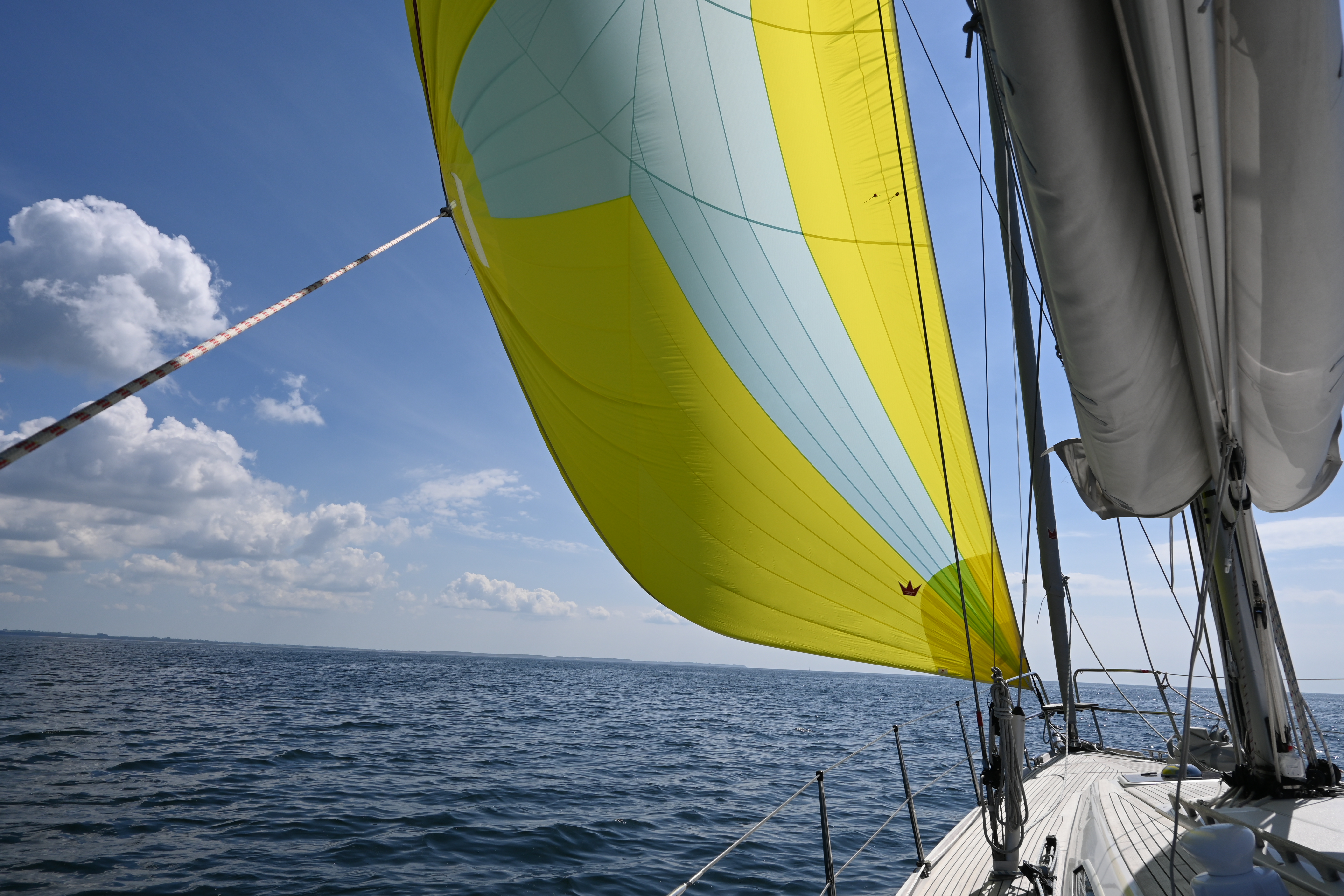 Ein herrlicher Segeltag ohne Motor. Achterlicher Wind mit Fock und Groß. Später als der Wind stärker wurde (in Boen 9 m/s) sind wir nur mit dem Groß unterwegs. Die Fock ist bei Raumschots nicht unbedingt nötig und nervt, weil sie bei den Wellen immer einfällt. Die Geschwindigkeit geht etwas runter, aber die Ruhe nimmt zu.
