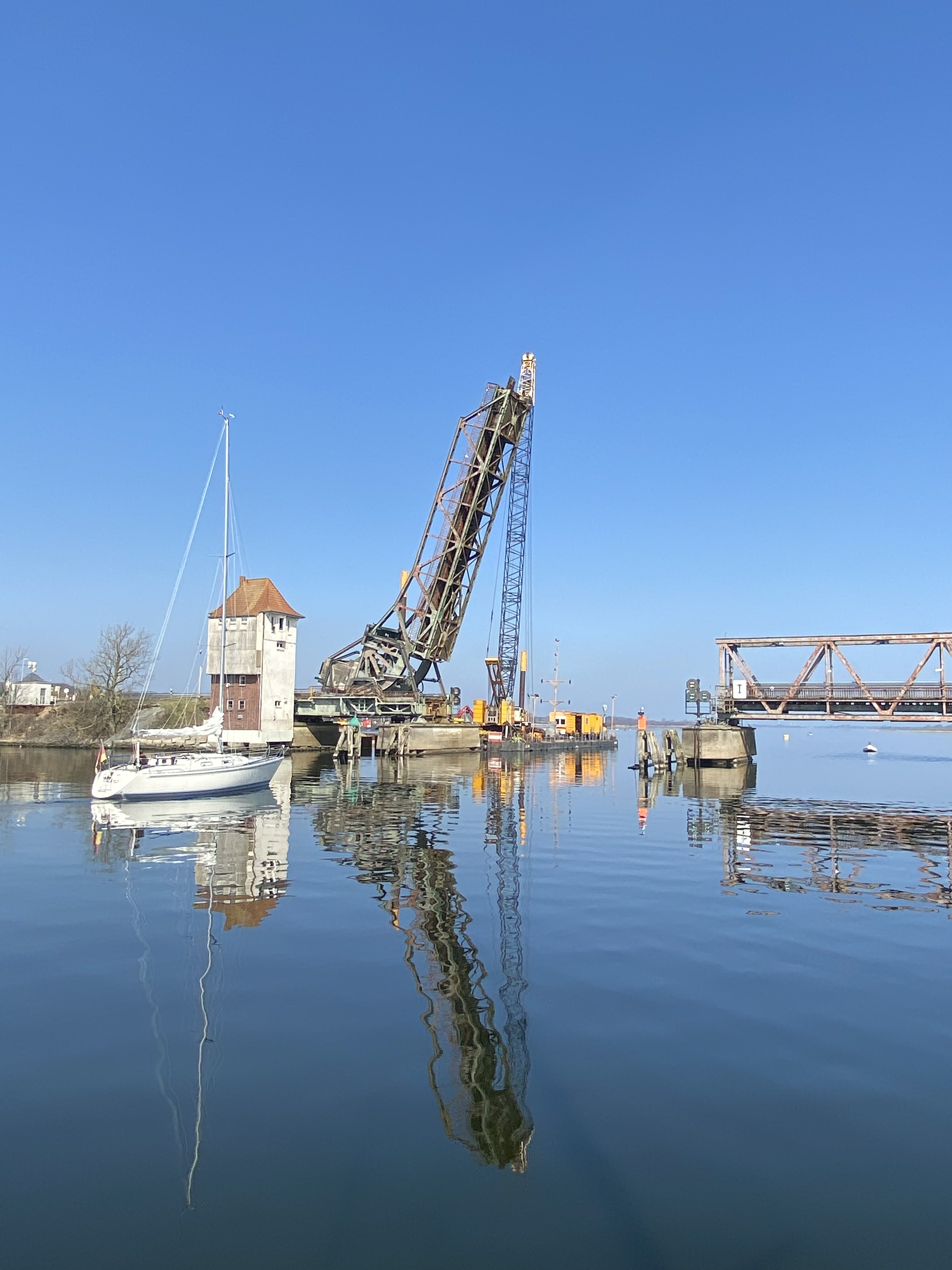 Wenn man in den Osten will, muss man durch die Fehmarnsundbrücke und an Heiligenhafen vorbei. Das sind immerhin über 40sm. Eigentlich haben wir uns vorgenommen, so selten wir möglich zu motoren. Aber der Wind war weg und wir hatten abends eine Verabredung zum Essen mit Schwester und Schwager von Ute, die dort oben leben. Also Vorsatz gebrochen.