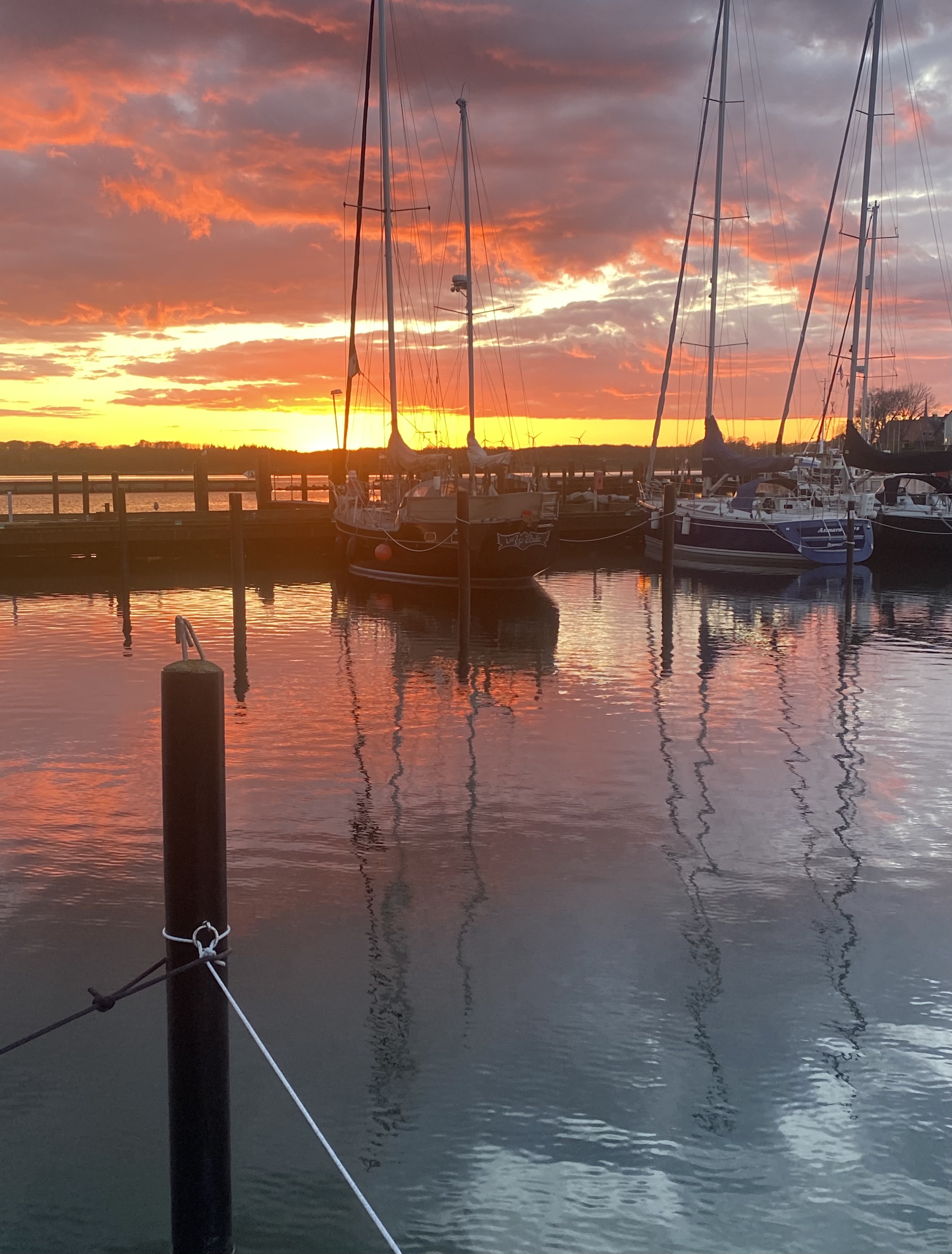 In Maasholm dann die große Überraschung: Unsere Stegnachbarn, die uns die ganzen Wochen mit dem Blog und auf „Marine Traffic“ verfolgt haben, empfangen uns mit einem Plakat. Wir sind wirklich überrascht und freuen uns unheimlich über die Aktion. Auch noch eine Flasche Prosecco geben Christine und Günter von der M/S Adeja aus, die trinken wir gemeinsam, gleich nachdem die Leinen fest sind.