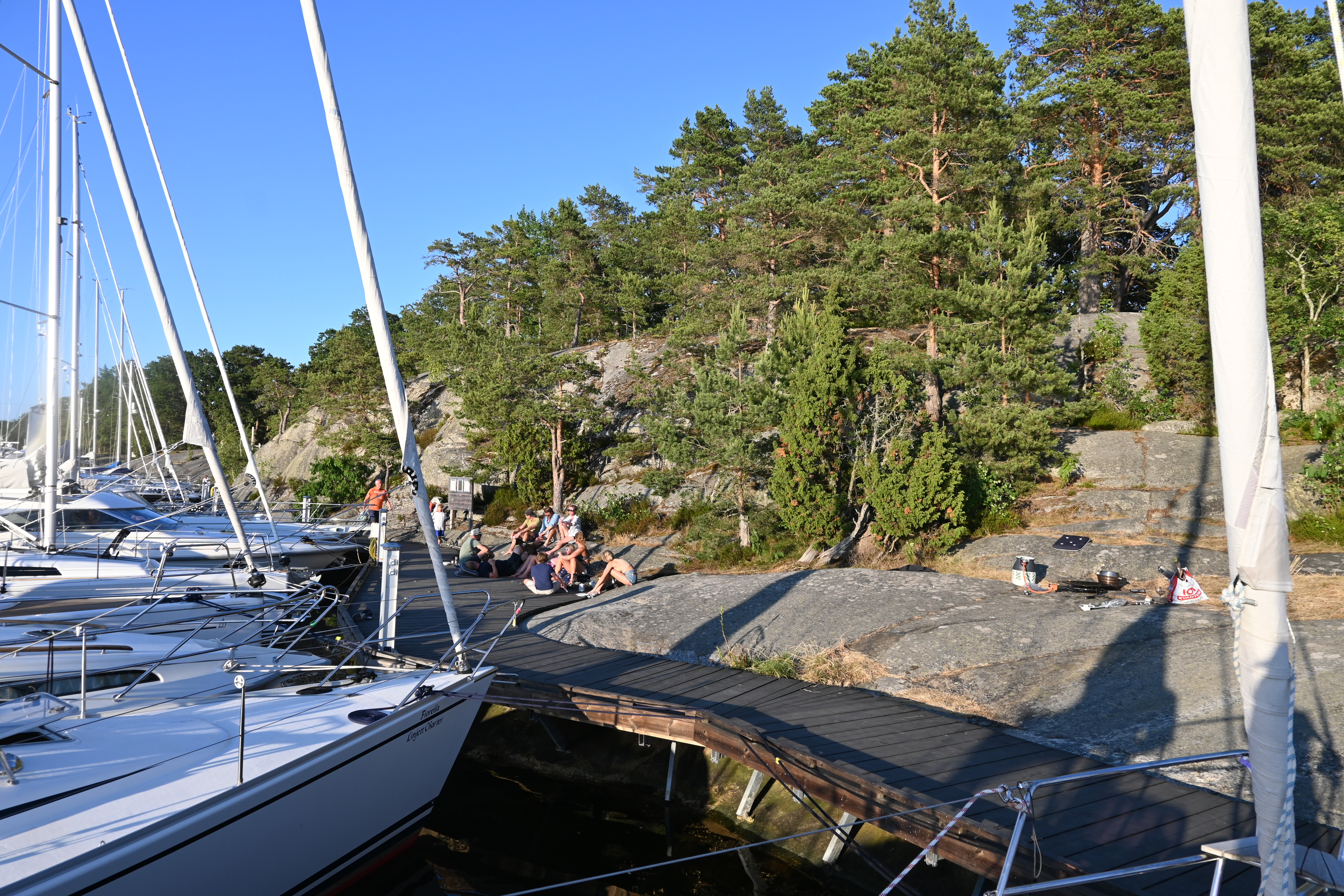 Wir lernen mit Heckanker anzulegen. Haben wir bisher sehr selten gemacht. Beim ersten Versuch greift der Anker nicht, dann nochmal und viel weiter weg. Dann klappt es. Wir erfahren, dass man in der Stockholmer Region eher ein Motorboot und kein Segelboot hat.