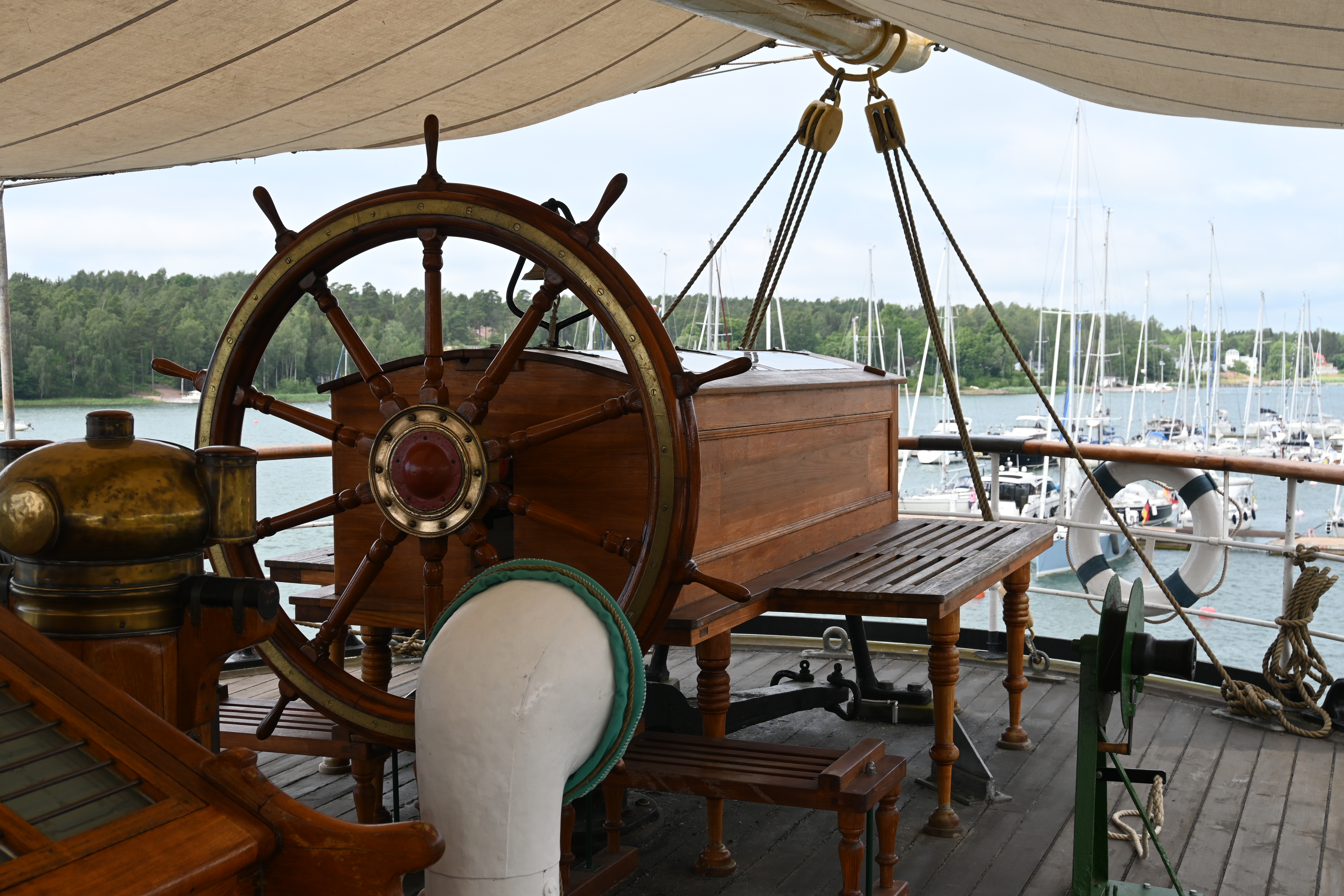 Beim Anlegen in Byxelkrok kam der Wind direkt von der Seite, dann sind die Heckbojen nicht optimal, da das Schiff einige Sekunden/Minuten ohne wirklich Führung ist. Da der Hafen fast leer war, stützen auch keine Nachbarschiffe. Für solche Situationen ist das Bugstrahlruder sehr angenehm.