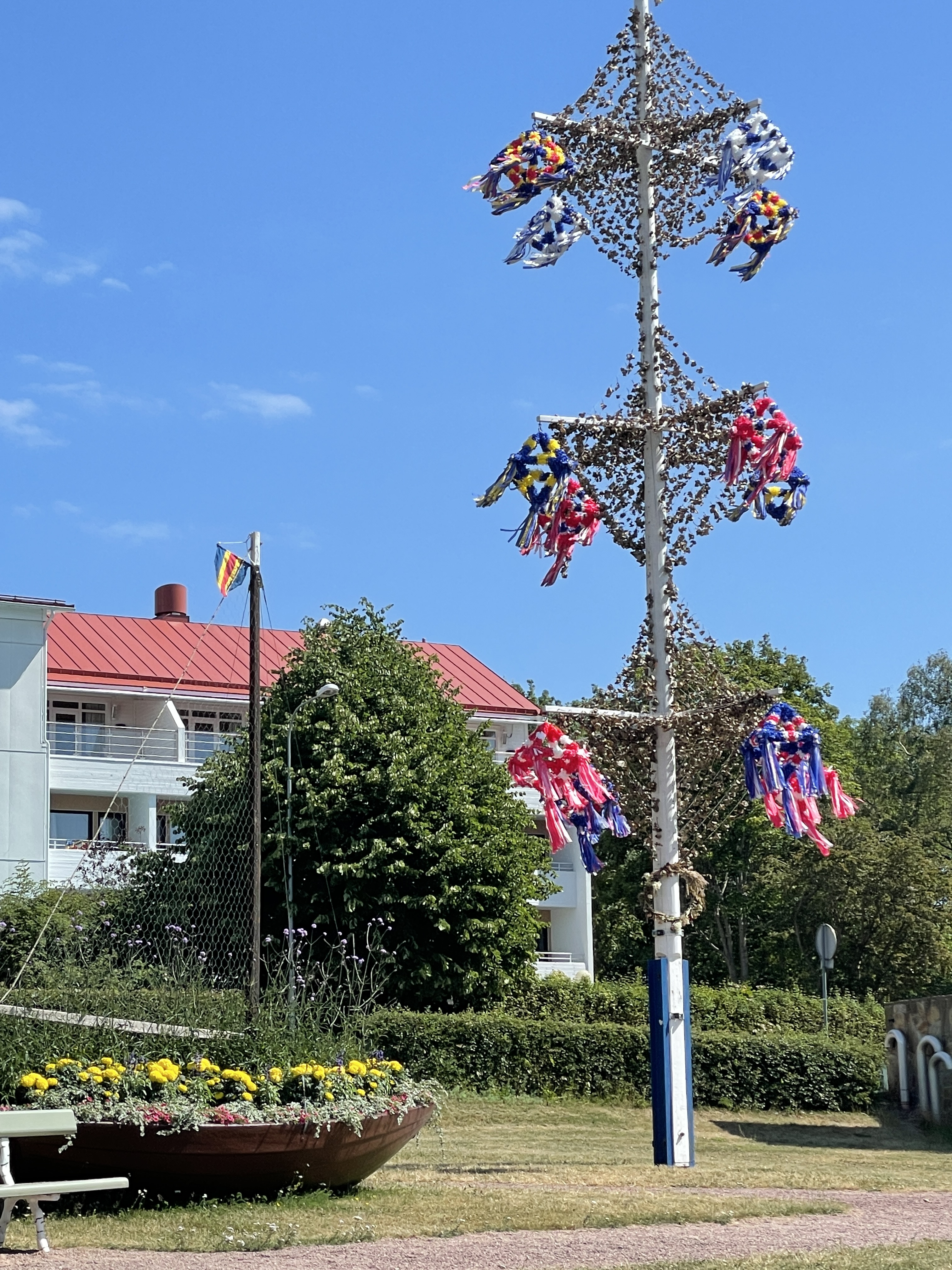 Wir hatten genug von der Party Insel und flüchten am Samstag. Dabei war die eigentliche Midsommar-Party am Freitag gar nicht so laut und lang. Sondern der Tag wurde in der Familie und mit Freunden verbracht, dabei hatten die Mädels einen geflochtenen Blumenkranz um den Kopf. Statt wie üblich um den geschmückten Baum zu tanzen, stand dieser symbolisch überall rum, sogar auf den Fähren.
