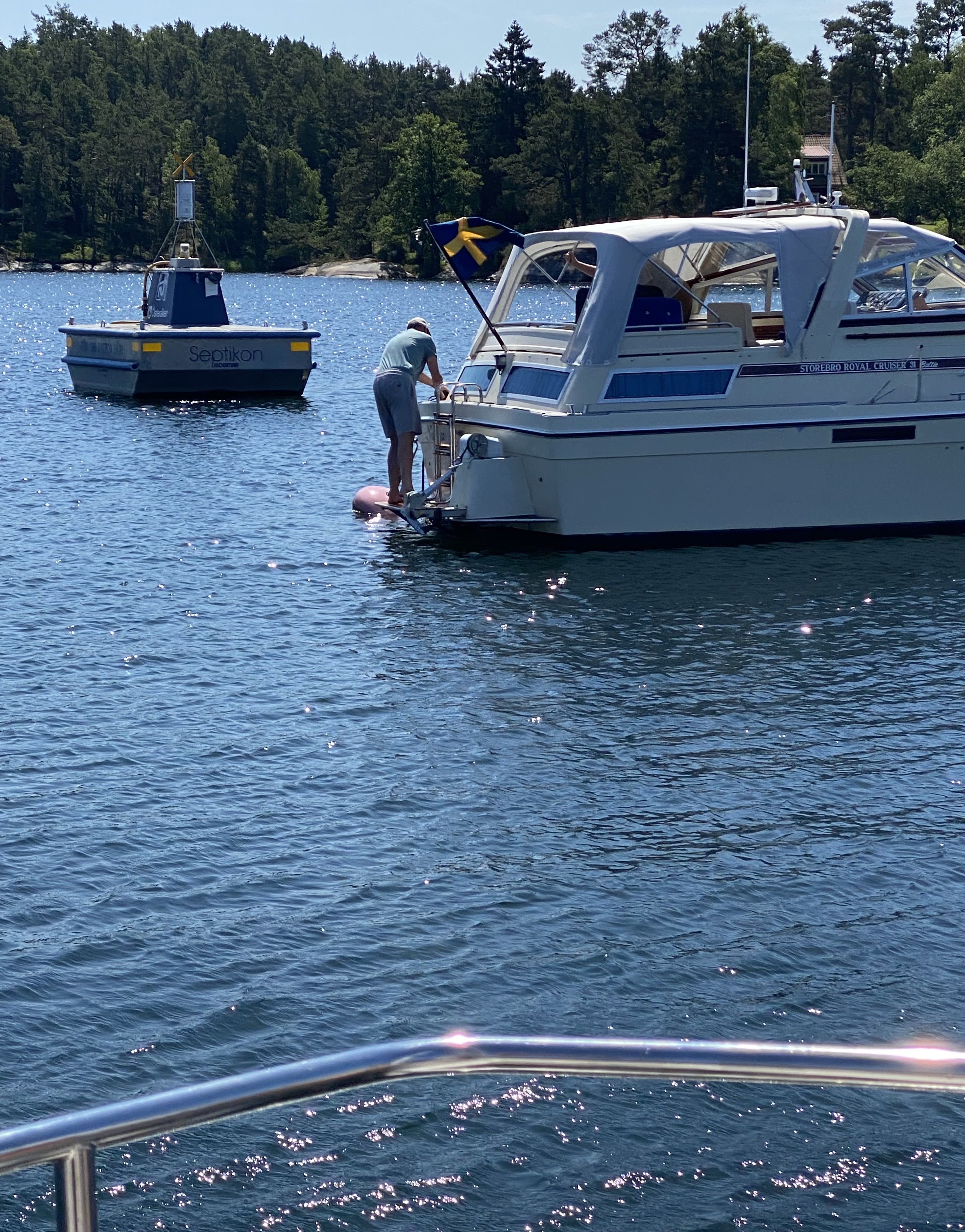 Das schwedische Pendant zum Kreuzer-Club heißt „Svenska Kryssarklubben, http://www.sxk.se“. Der Club stellt an vielen Plätzen Ankerbojen bereit, an denen man als Mitglied festmachen kann. Das kostet ca. 60 Euro pro Jahr und ist auch für Ausländer möglich. Das werden wir im nächsten Jahr machen, ein kleiner Wimpel zeigt dann die Mitgliedschaft an.