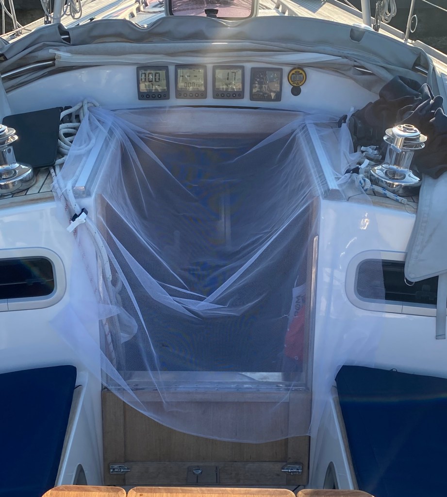 Wir hatten fast immer Sonne. Auch wenn das nicht jedes Jahr so sein wird – es fehlte ein Bimini. Also ein Zeltdach, dass auch während der Fahrt oben ist. Im Mittelmeer Standard und viele Schweden haben auch eines.