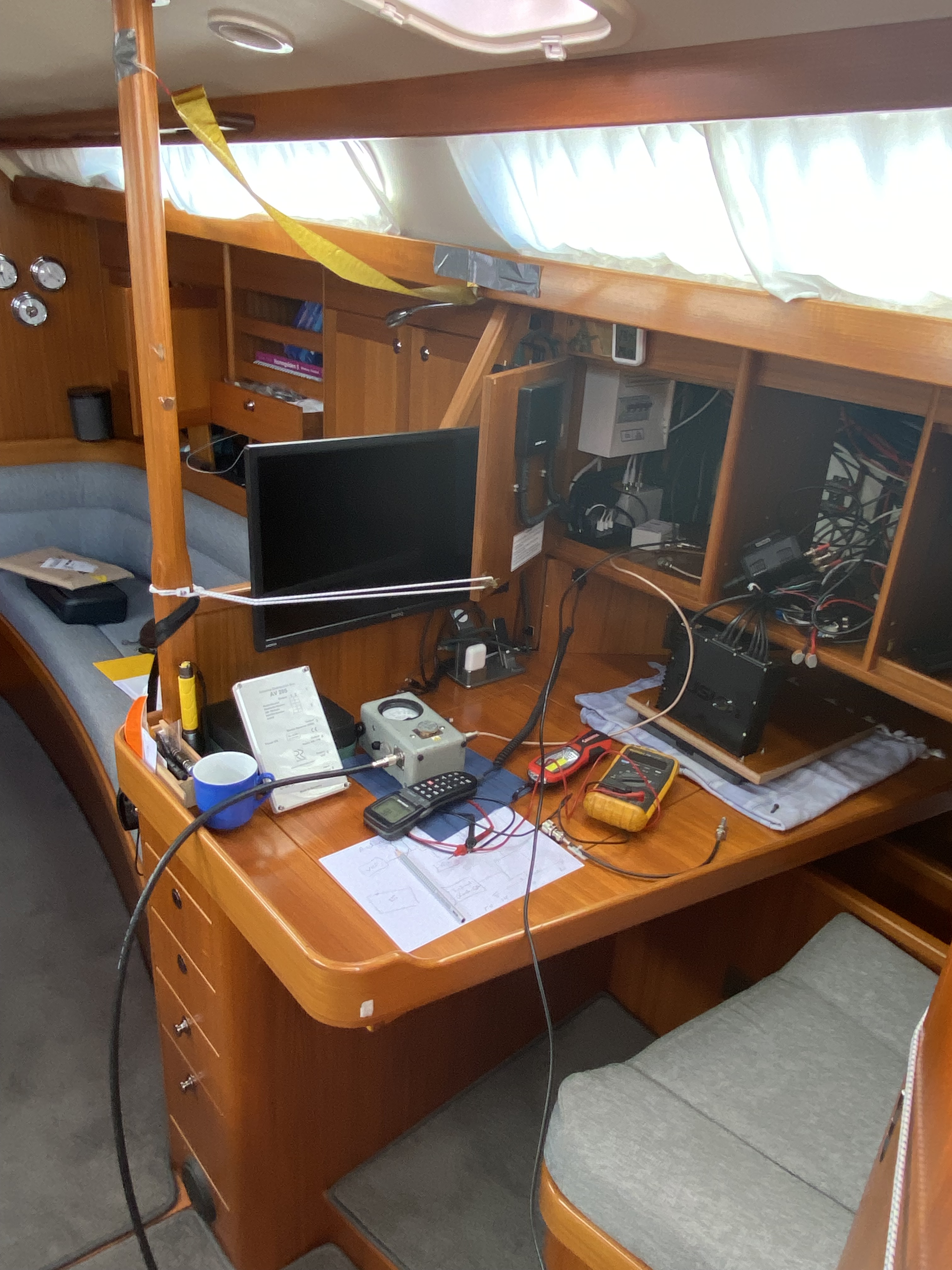 Irgendetwas geht immer kaputt. Wäre natürlich genial, wenn man vorher wüsste was! Diesmal ist durch Blitz (Überspannung) der Verstärker der Funkantenne kaputt gegangen. Auch wenn man den Funk nur sehr selten benutzt, ohne fühlt man sich gerade bei dem Queren der diversen Schifffahrtslinien und großen Distanzen ohne Mobilfunkempfang unwohl. Deshalb macht ein Funk-Handgerät und eine Notfallantenne, die man direkt an die Black-box des DSC Geräts anschließt, viel Sinn. Die Antenne muss so hoch wie möglich und so weit weg von Mast und Wanten angebracht werden, siehe unseren Bericht.