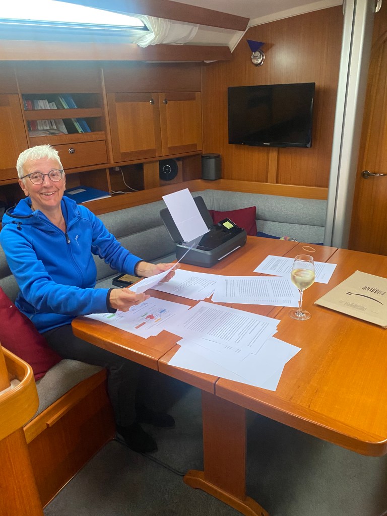Weitere 55 SM mit Rückenwind, oder wie der Segler sagt – Raumschots. Das ist zwar meistens sonnig und warm, aber auch wackelig wegen der Welle von hinten. Wir haben wieder alles ausprobiert: Motor, Code-Zero bei halbem Wind und schließlich Code-Zero als Butterfly. Um 16.30h waren wir im Hafen, aber nur, weil Ute mich um 6.00h aus dem Bett gescheucht hat und wir um 7.30h los sind. Ute: Und das an Marcus Geburtstag!