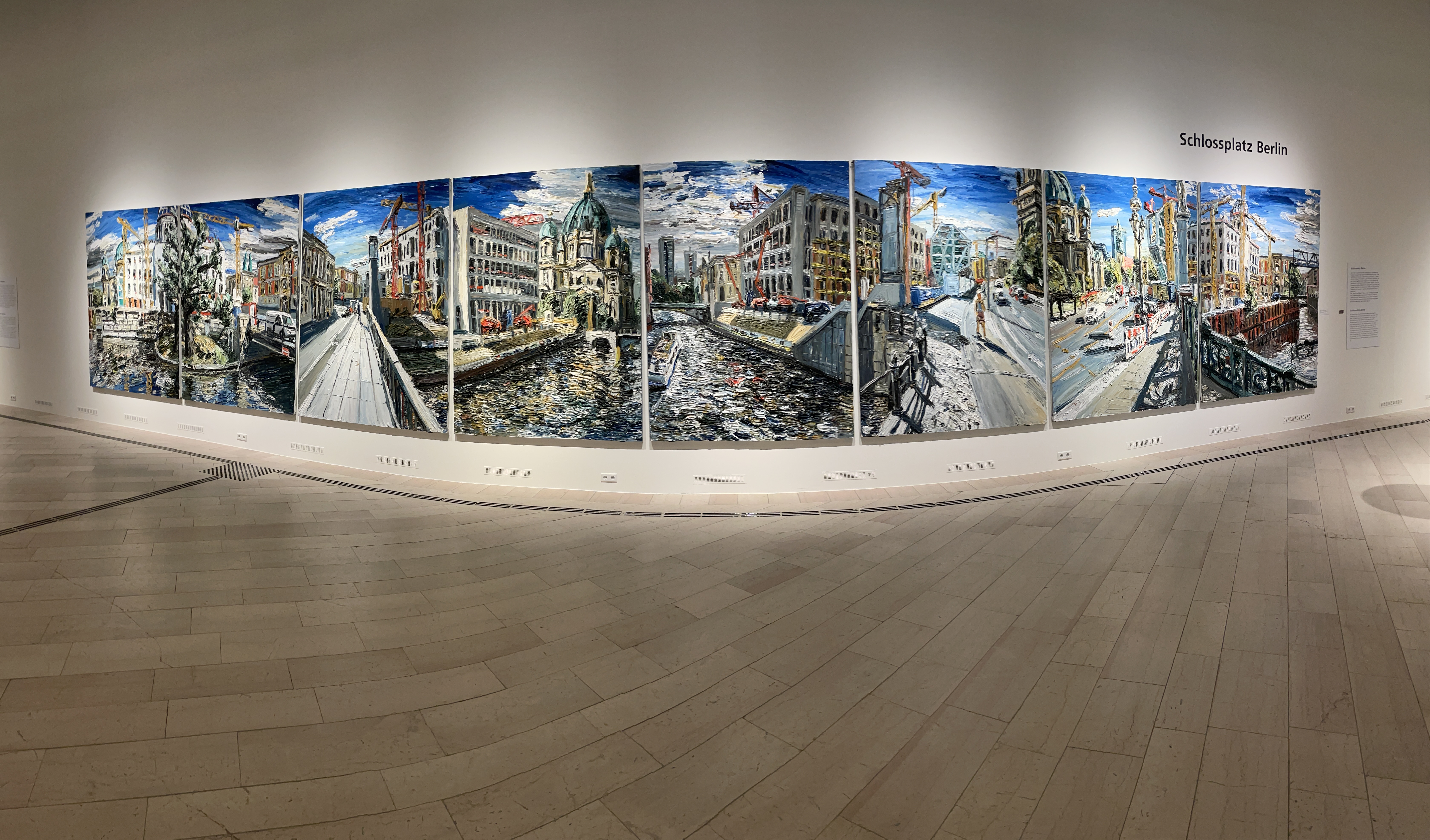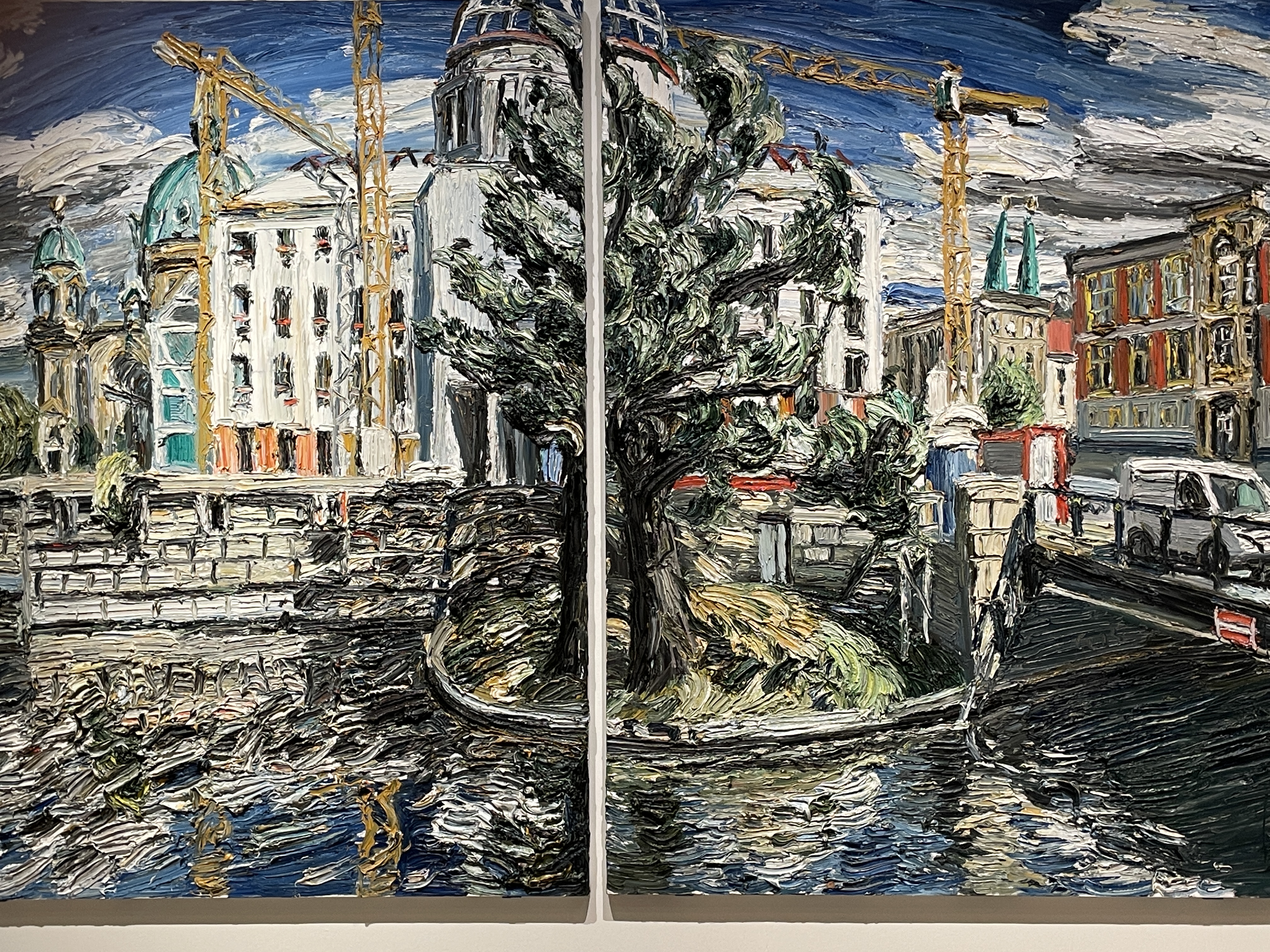 In der Reithalle von Schloss Gottorf in Schleswig erwartet uns die aktuelle Ausstellung von Christopher Lehmpfuhl aus Berlin. Von ihm haben wir schon gelesen und einen TV-Bericht gesehen. Er malt nicht mit dem Pinsel sondern trägt mit den Händen die Farbe so stark auf, dass ein erhabenes Bild, also mit dritter Dimension entsteht.